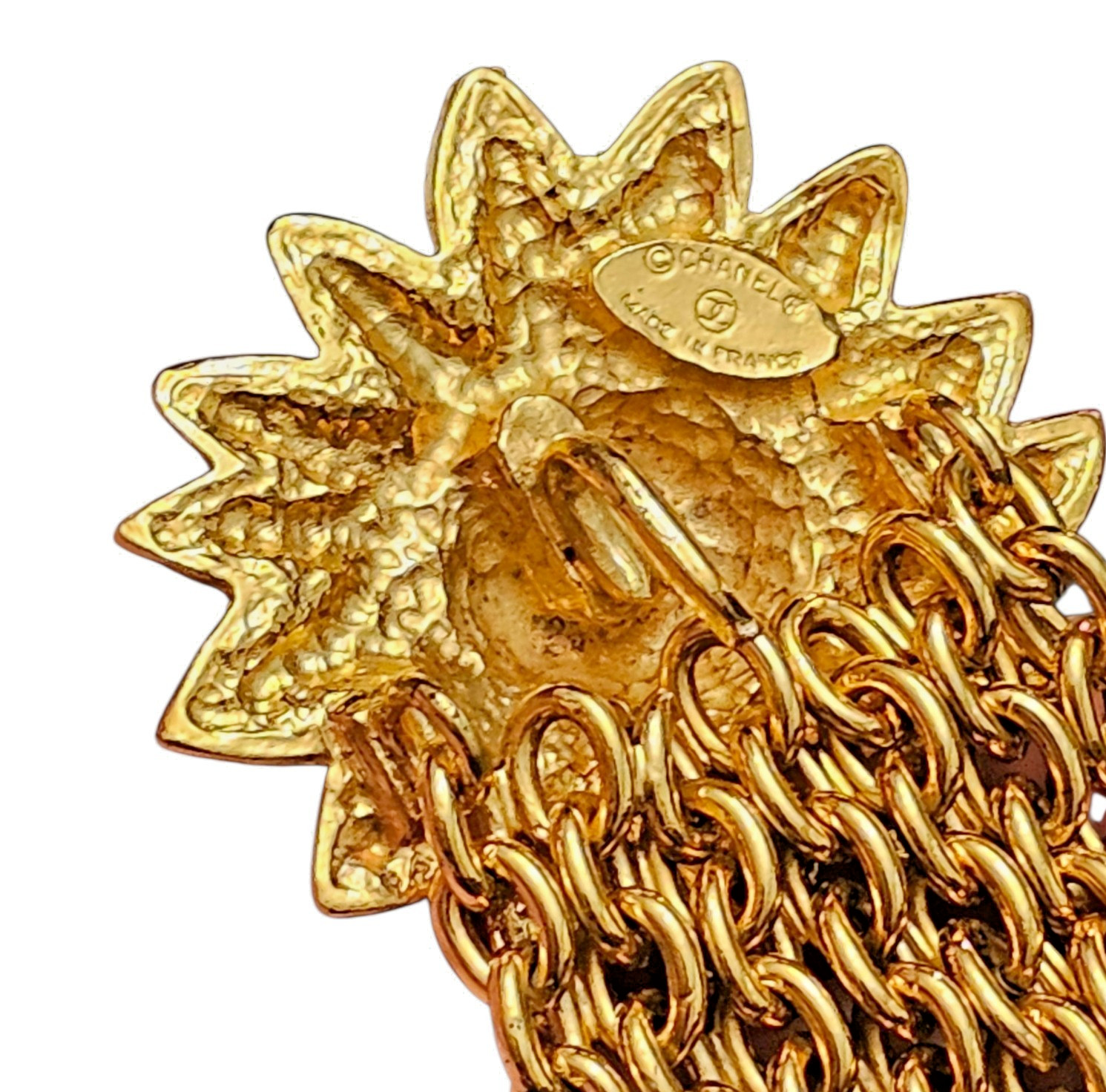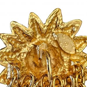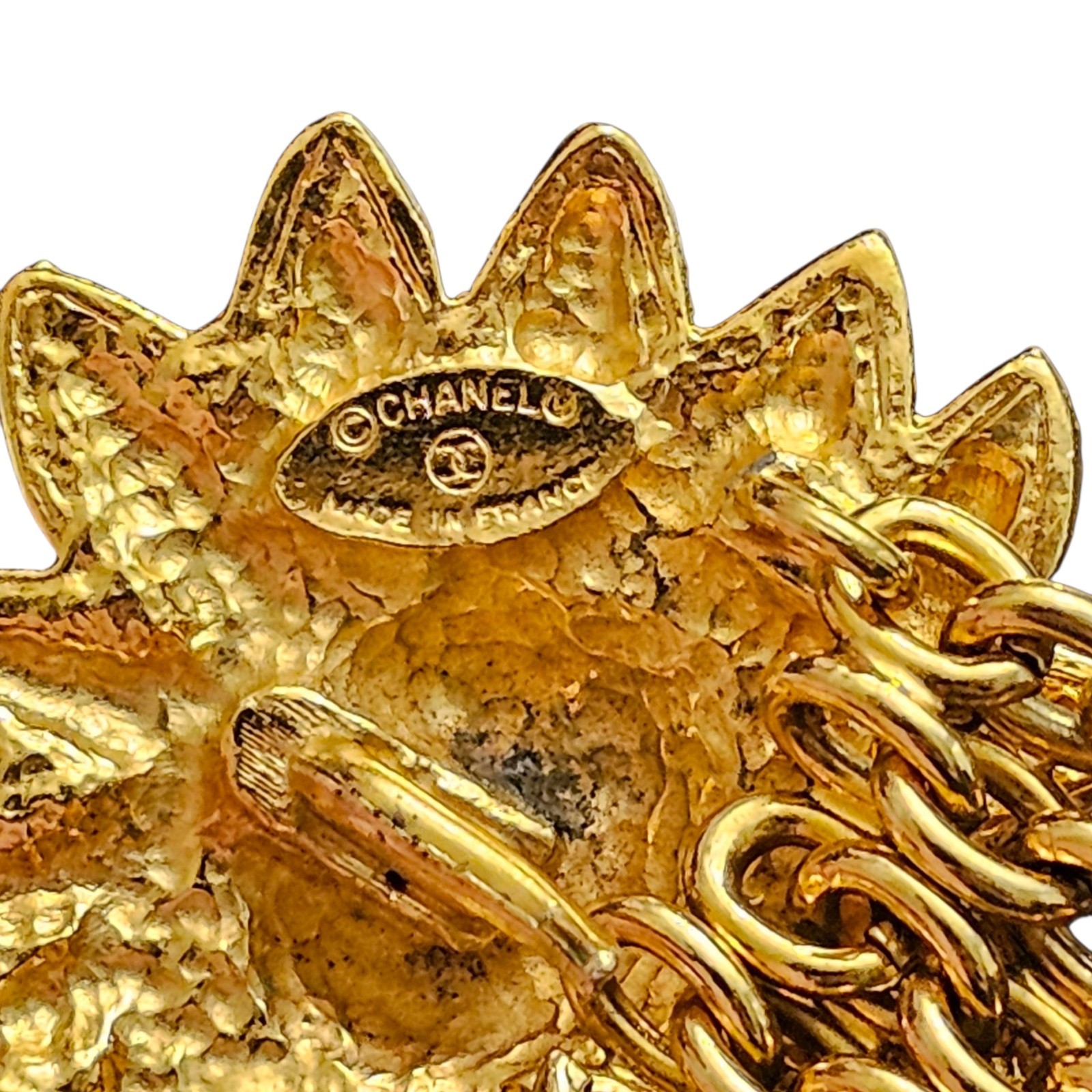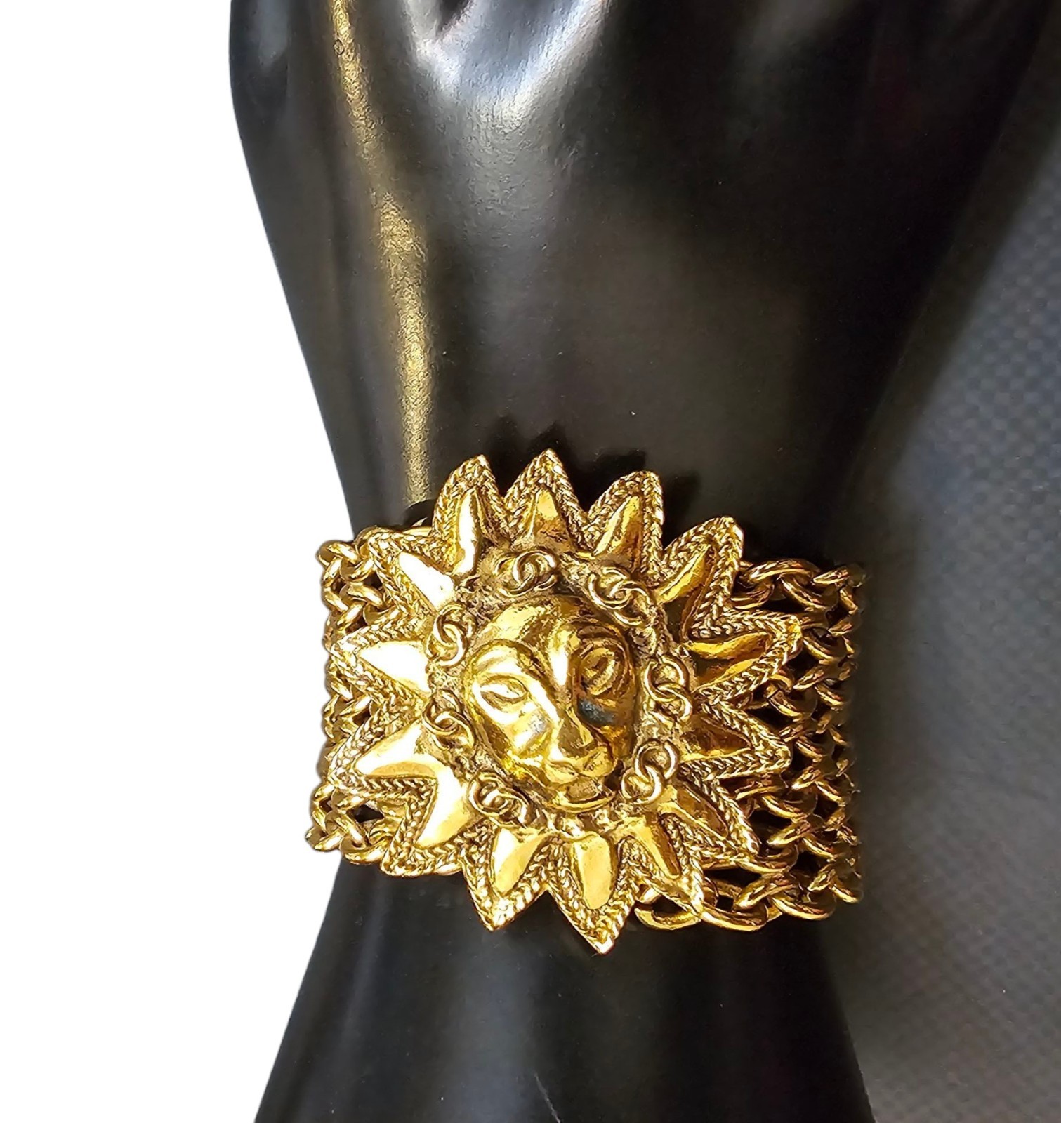 The lion’s face is framed by a dramatic sunburst motif, with flame-like rays extending outward in a textured, rope-like trim that gives the bracelet remarkable depth and detail. Encircling the lion are interlocking “CC” Chanel logos, subtly worked into the inner border of the medallion—adding a discreet yet iconic signature of the house.
