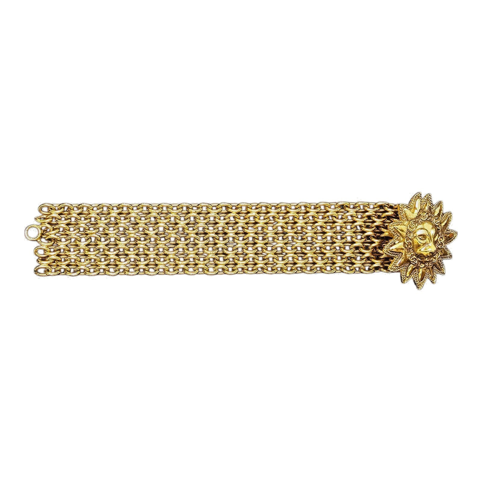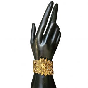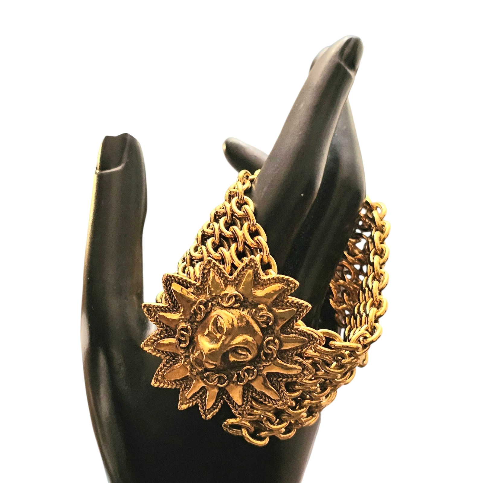 Channel timeless power and bold vintage elegance with this stunning Chanel bracelet, featuring an ornate lion medallion at its center. Crafted in rich gold-tone hardware, this piece is a true statement of 1980s-era Chanel design.