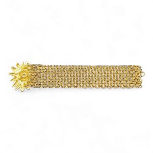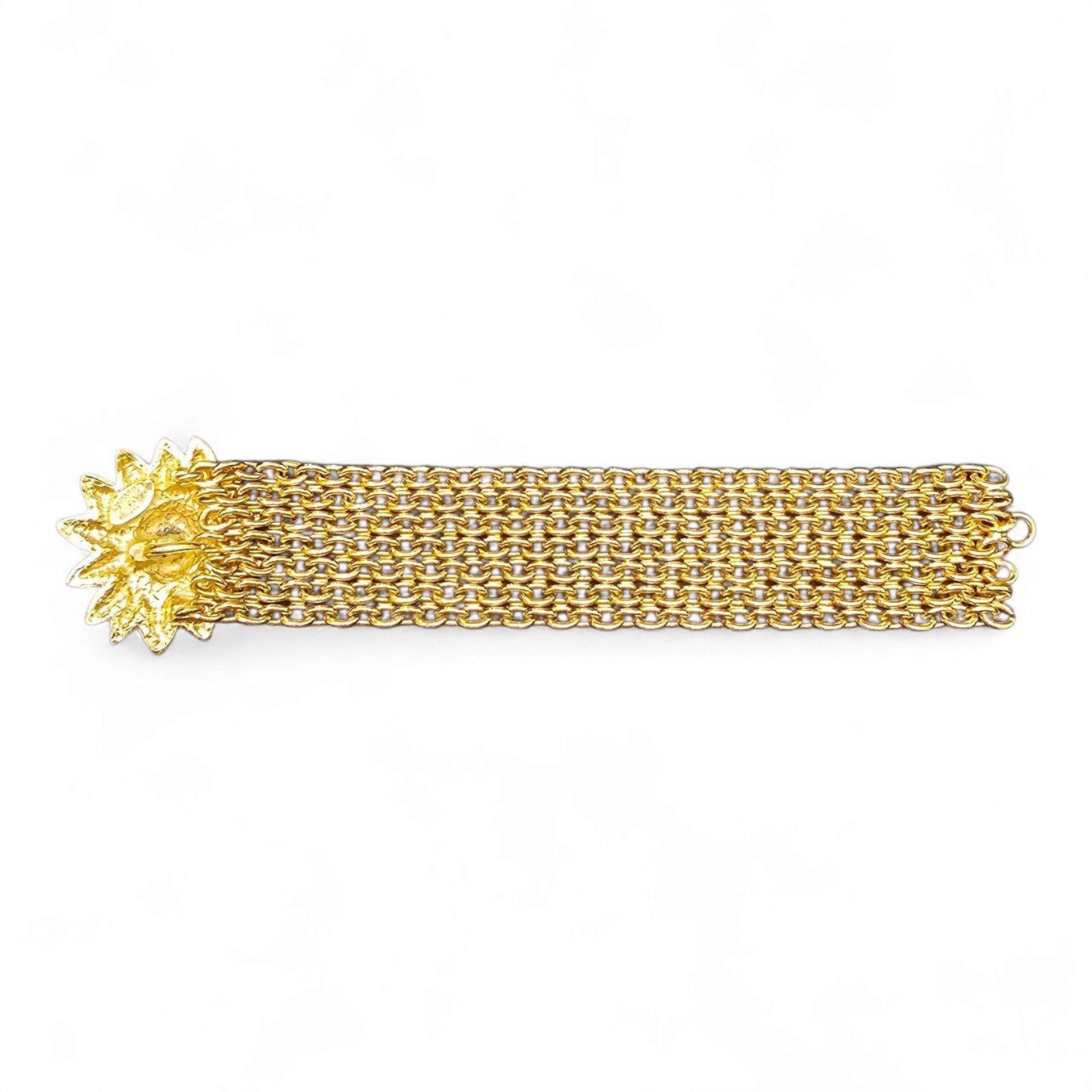 This standout bracelet features multiple layered gold chains, giving it a bold, chunky silhouette with incredible vintage character. A hook closure at the back is integrated into the design for a clean, secure fit.