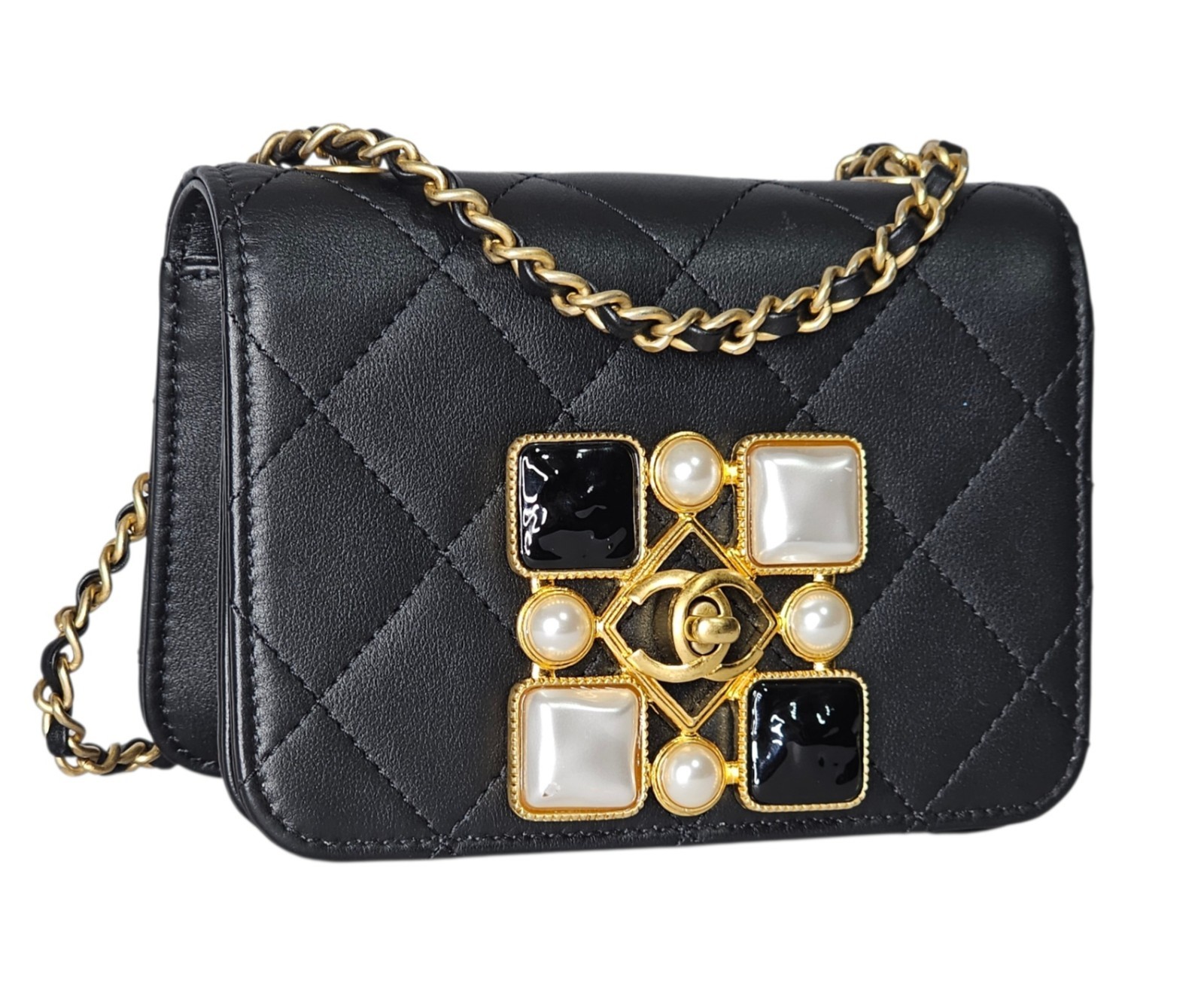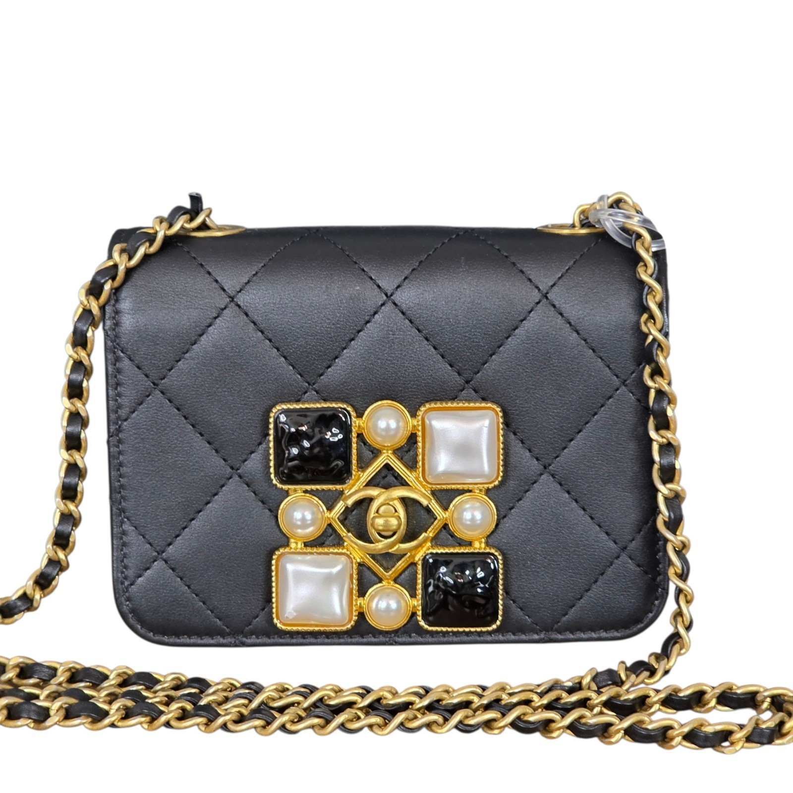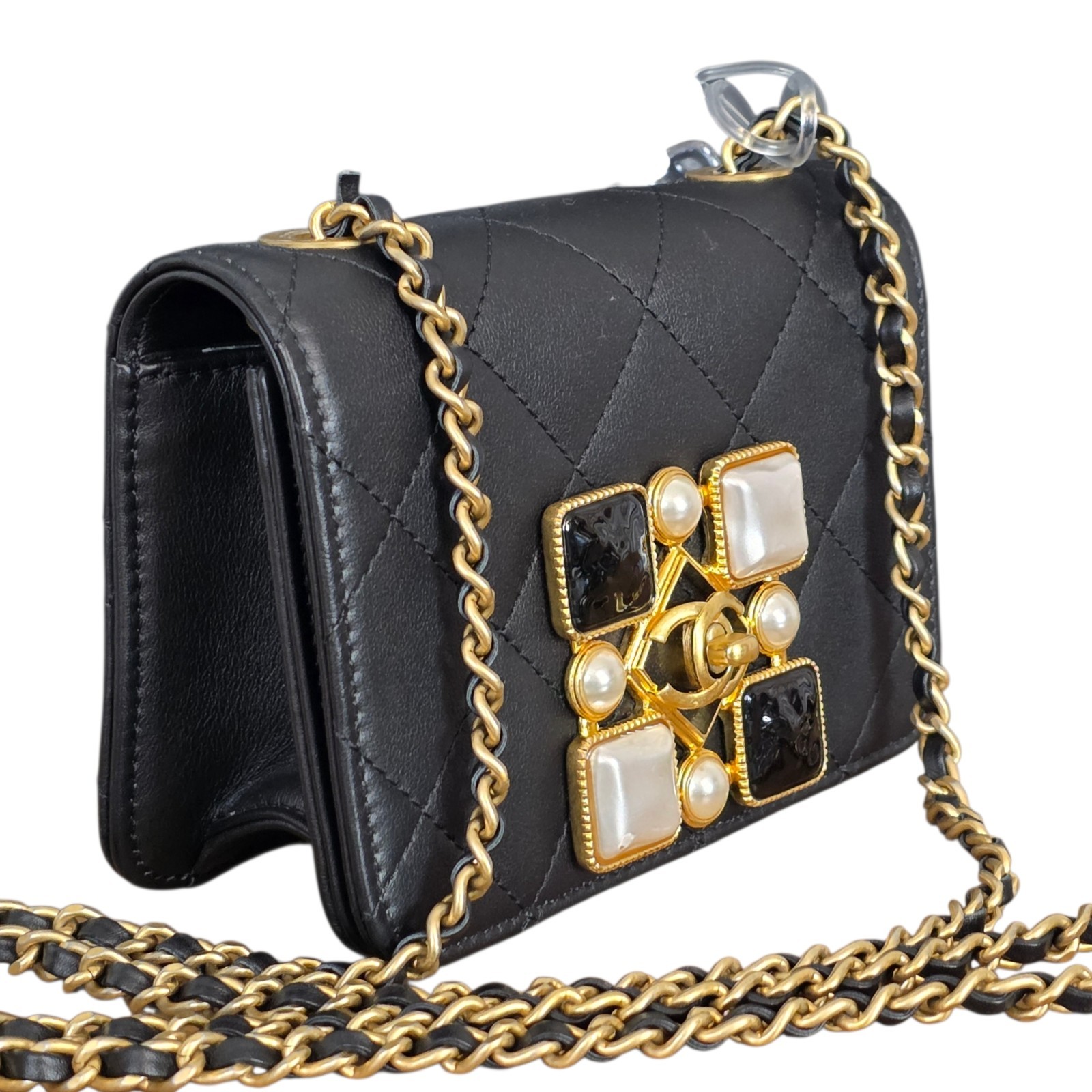 This mini flap wears like a piece of fine jewelry — the onyx and pearl embellishment paired with the starring CC motif creates a luminous focal point that elevates any outfit.