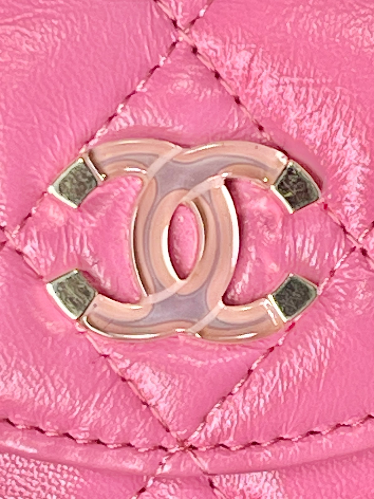 Crafted from luxurious shiny crumpled lambskin leather in pink, the coin purse features a flap design with a pink and light gold CC logo accent. The purse secures with a top zipper that opens to a neatly partitioned fabric-lined interior, perfect for carrying coins, cards, or other small essentials.