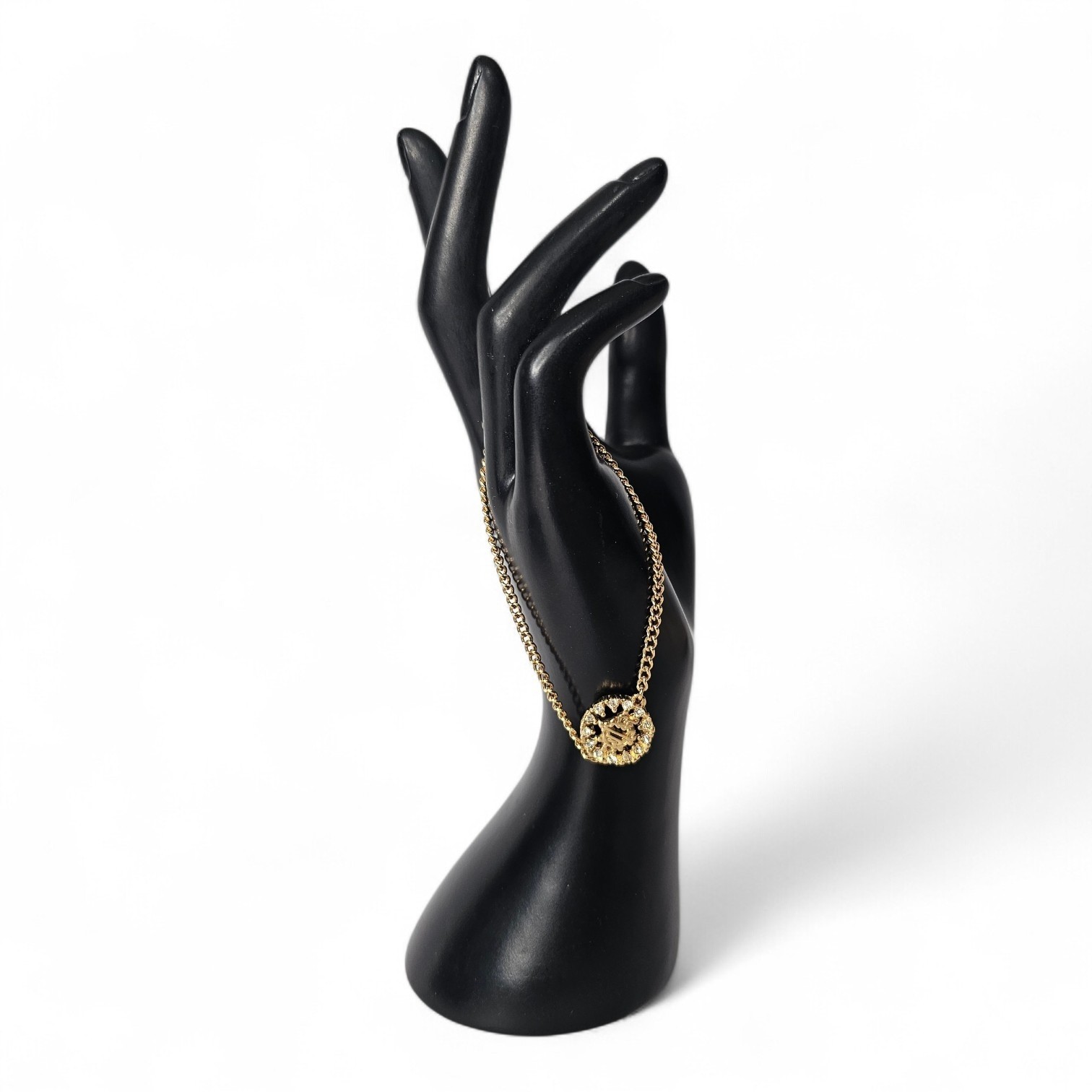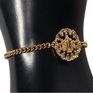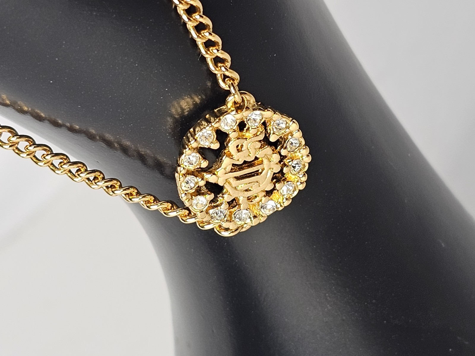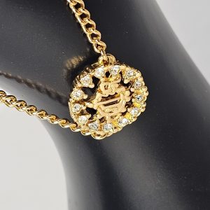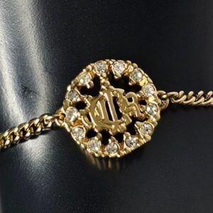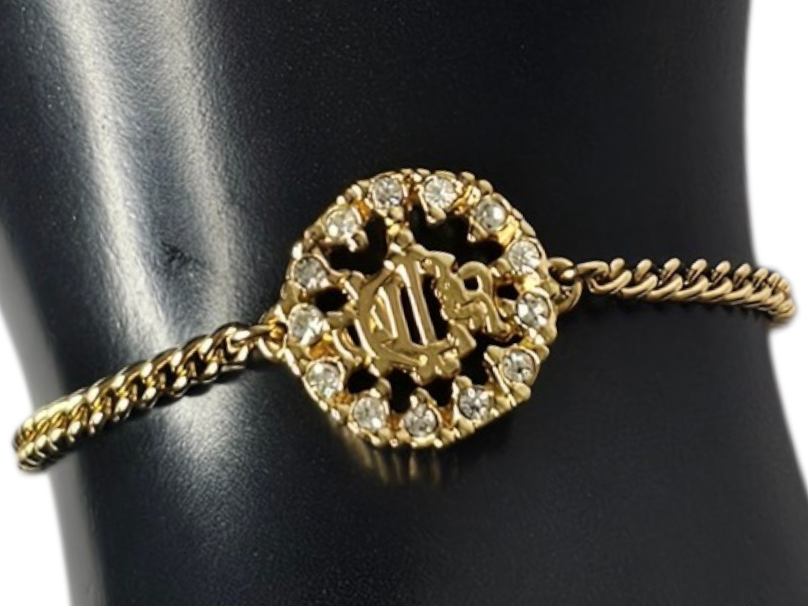 Authentic Christian Dior gold‑tone bracelet featuring a round medallion accented with clear crystals and a crown‑style monogram at the center. The chain and medallion have a heavier weight, giving the piece a solid, substantial feel typical of Dior’s late 1990s to early 2000s jewelry designs. The lobster clasp closes securely.