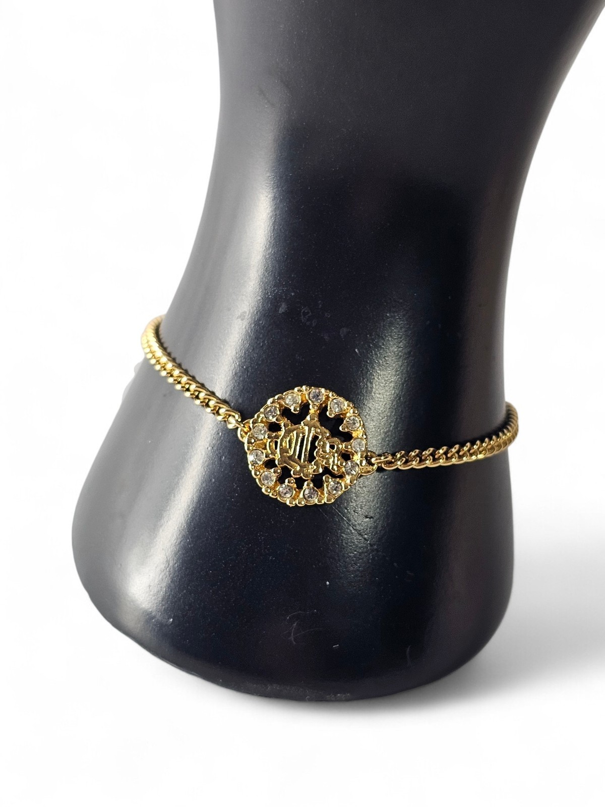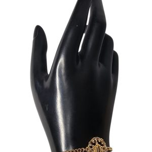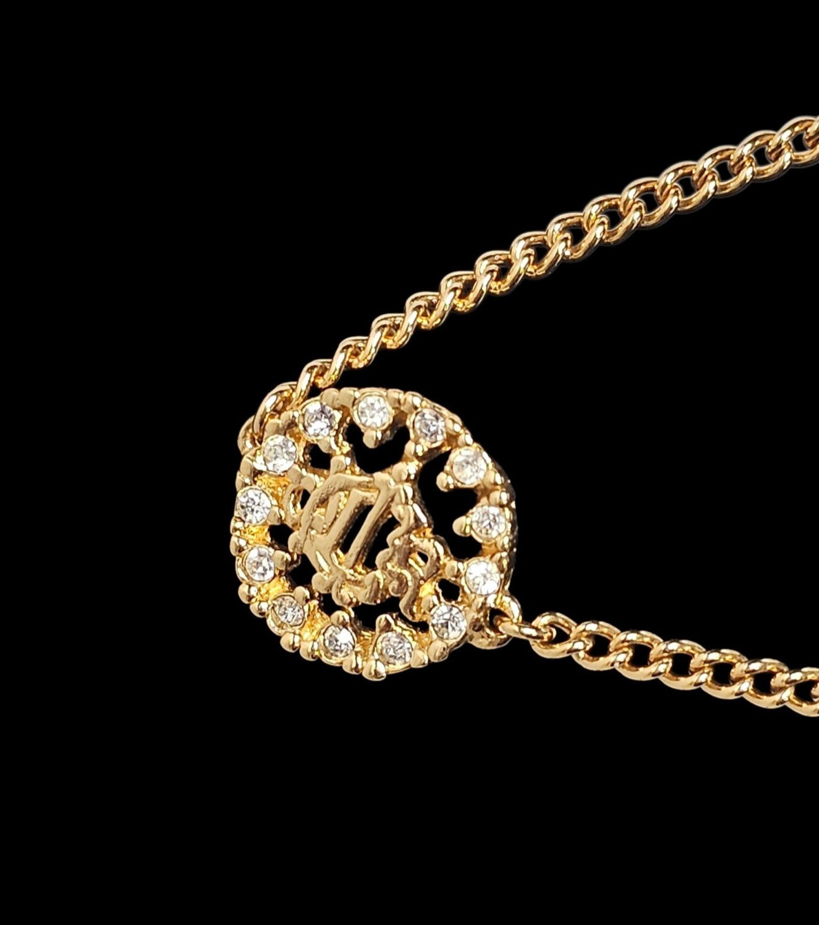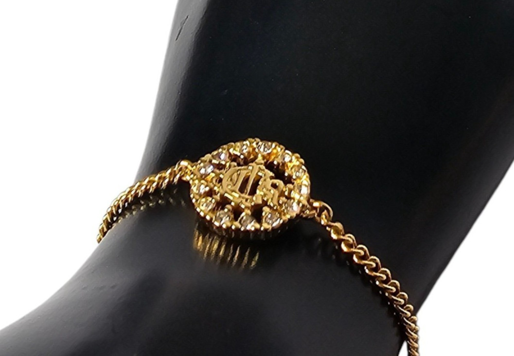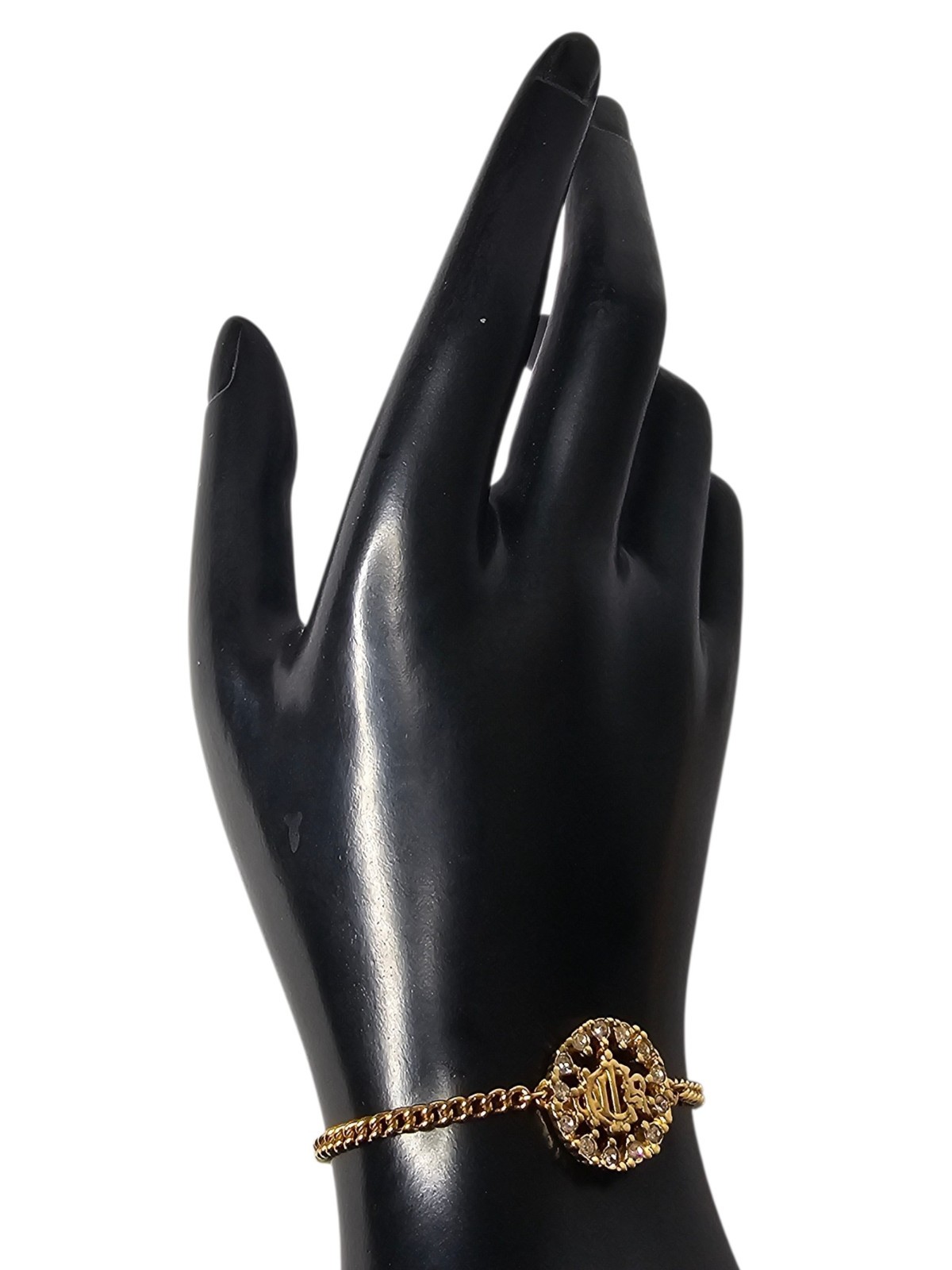 Authentic Christian Dior gold‑tone bracelet featuring a round medallion accented with clear crystals and a crown‑style monogram at the center. The chain and medallion have a heavier weight, giving the piece a solid, substantial feel typical of Dior’s late 1990s to early 2000s jewelry designs. The lobster clasp closes securely.