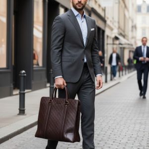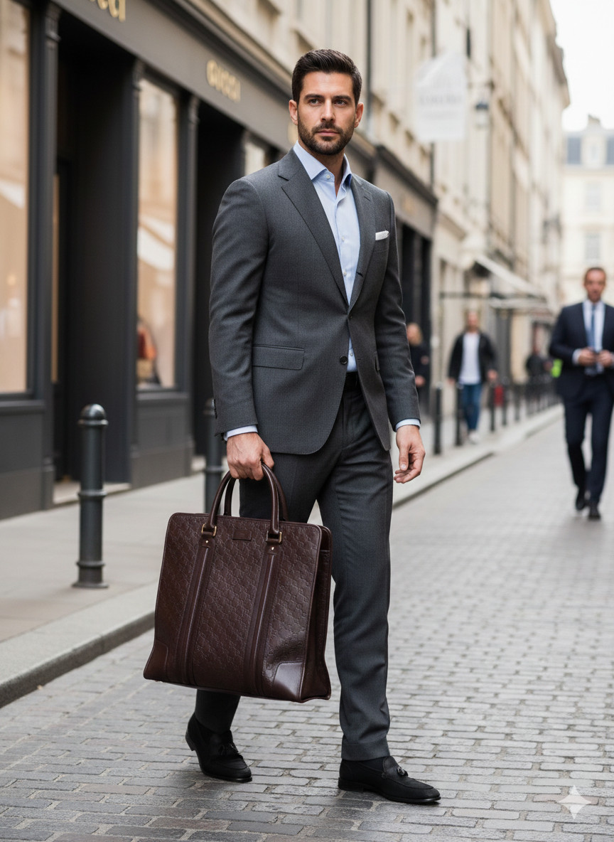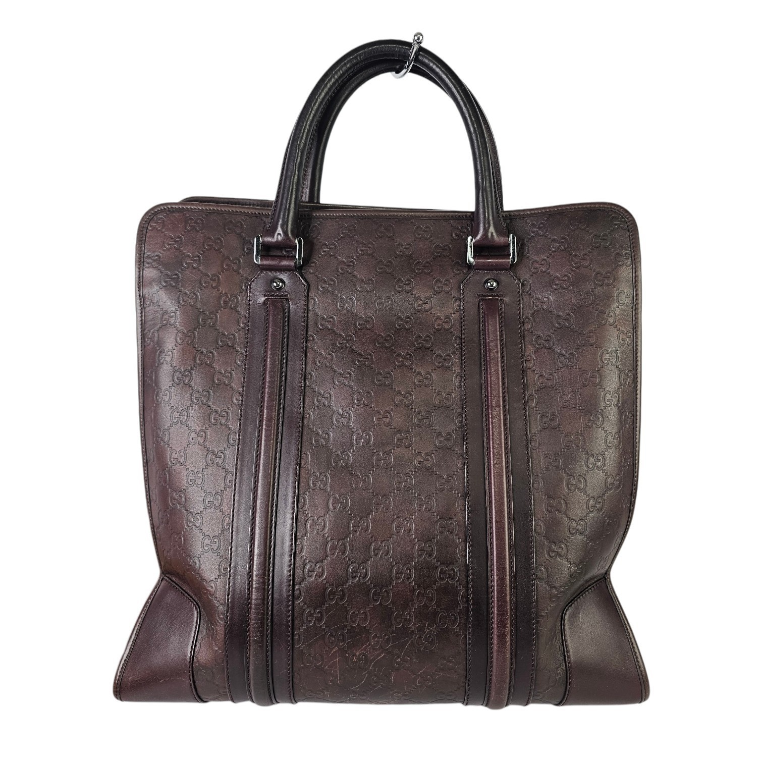 Brown Guccissima embossed leather travel tote crafted from rich, supple leather featuring the iconic GG monogram throughout. This spacious tote is designed with dual brown leather top handles and gunmetal tone hardware, offering a refined yet practical silhouette ideal for travel, work, or everyday use. The structured yet roomy design makes it ideal as a laptop bag, portfolio bag for artwork or sketch papers, a great carry on for flights, or an everyday commuter style with timeless appeal.