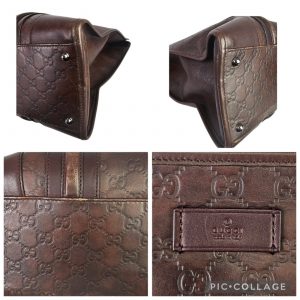The exterior is brown Guccissima embossed leather with matching brown leather trim. The interior is lined in brown canvas and features a front cell phone pocket and a back zipper pocket for organization. Made in Italy.