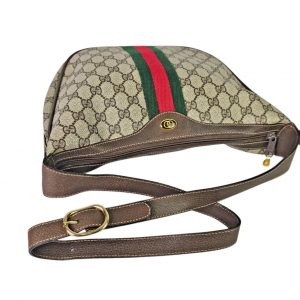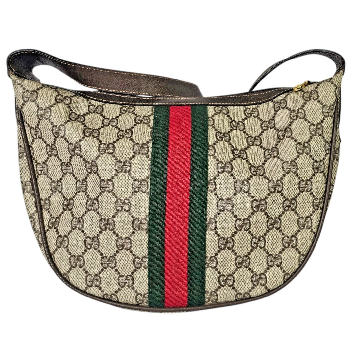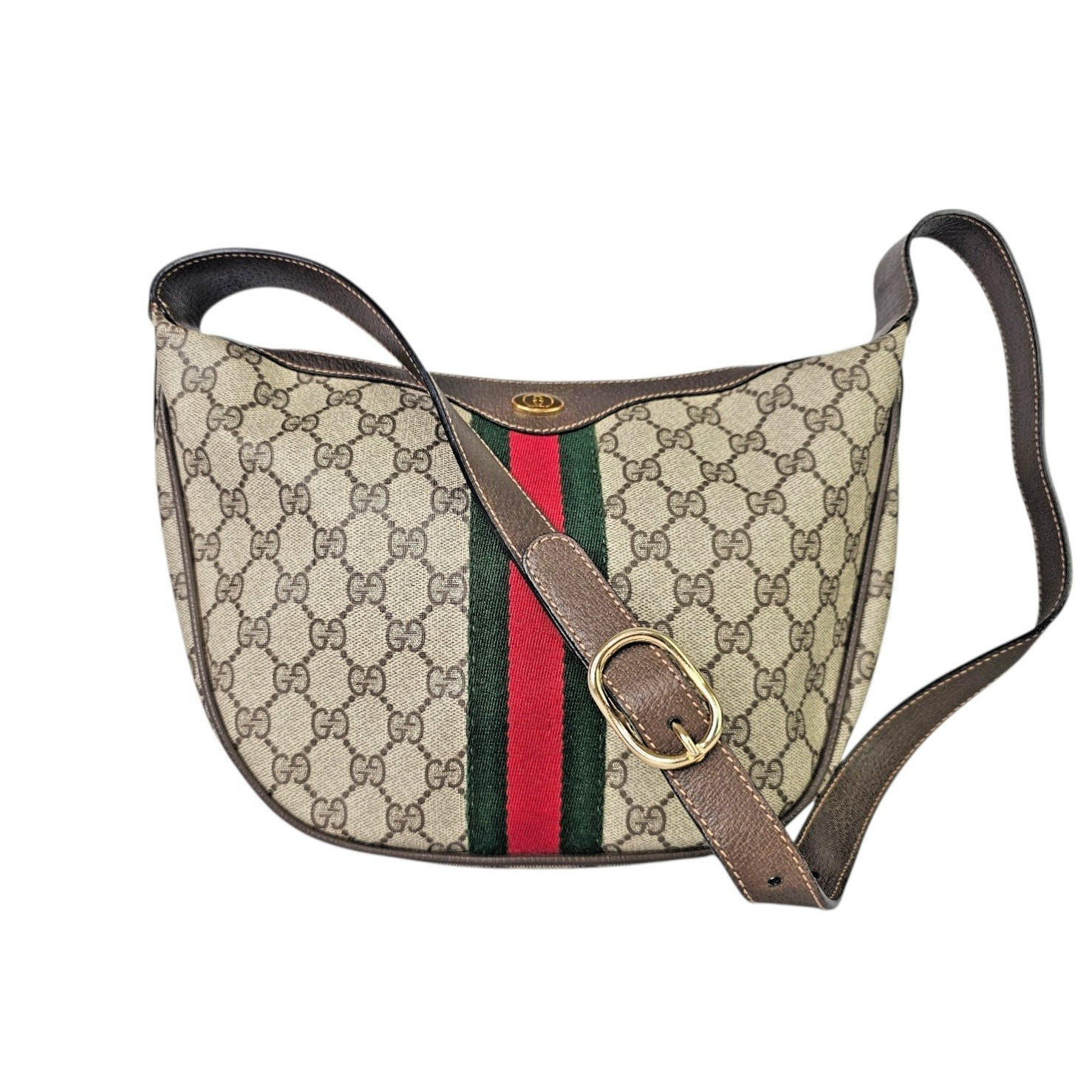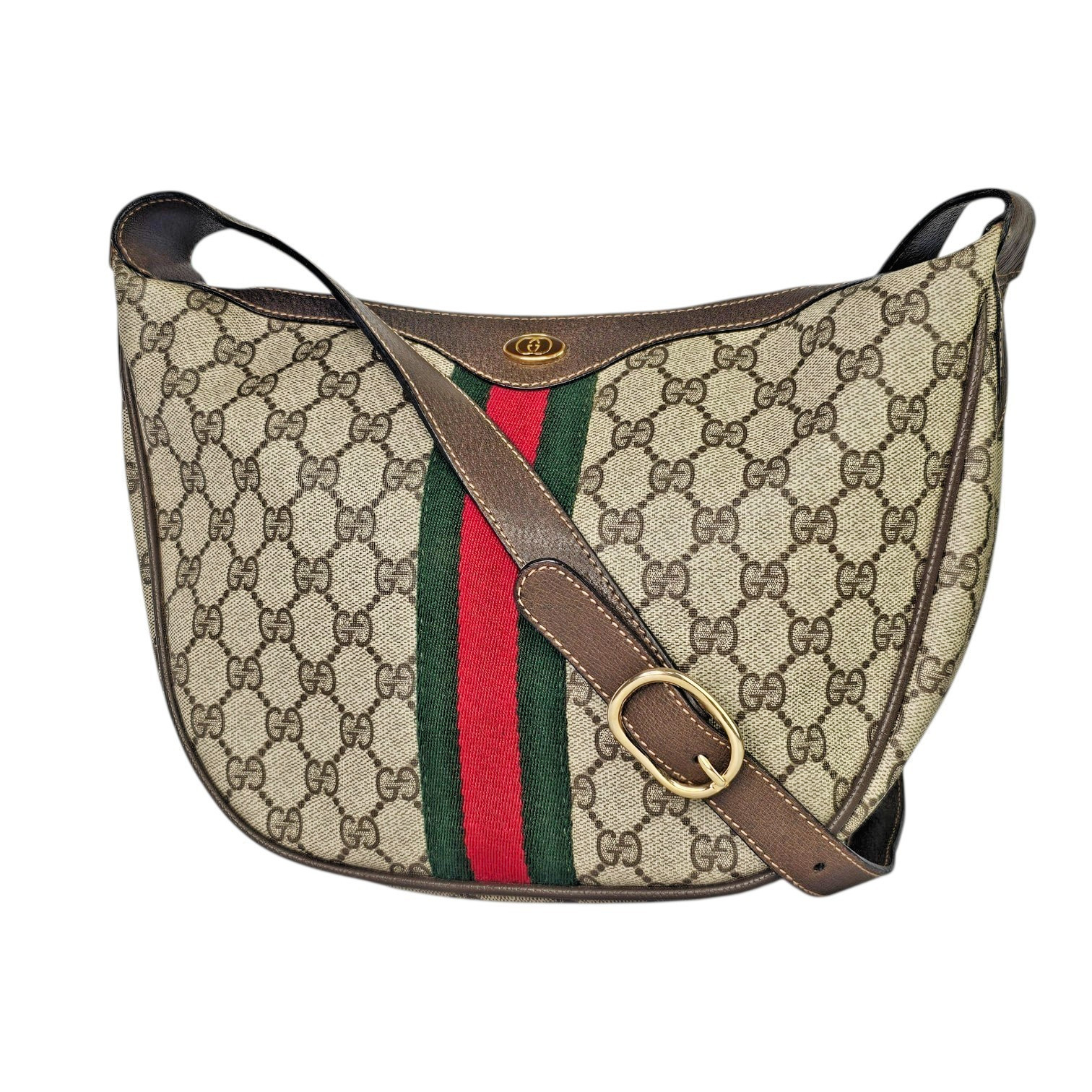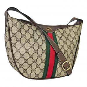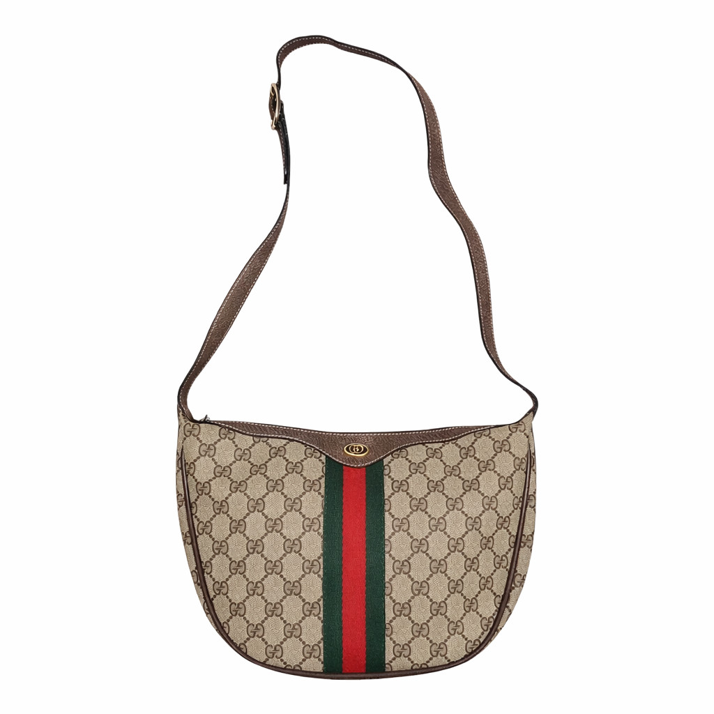 This original vintage Gucci Ophidia Half Moon Hobo is crafted in classic brown GG coated canvas with rich leather trim and gold tone hardware, featuring the iconic red and green Web stripe running vertically down the center of both the front and back. This is the true early made in Italy version of the Ophidia that has since been reissued, making it especially desirable for collectors and vintage Gucci lovers.