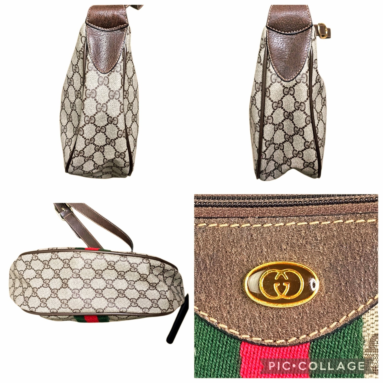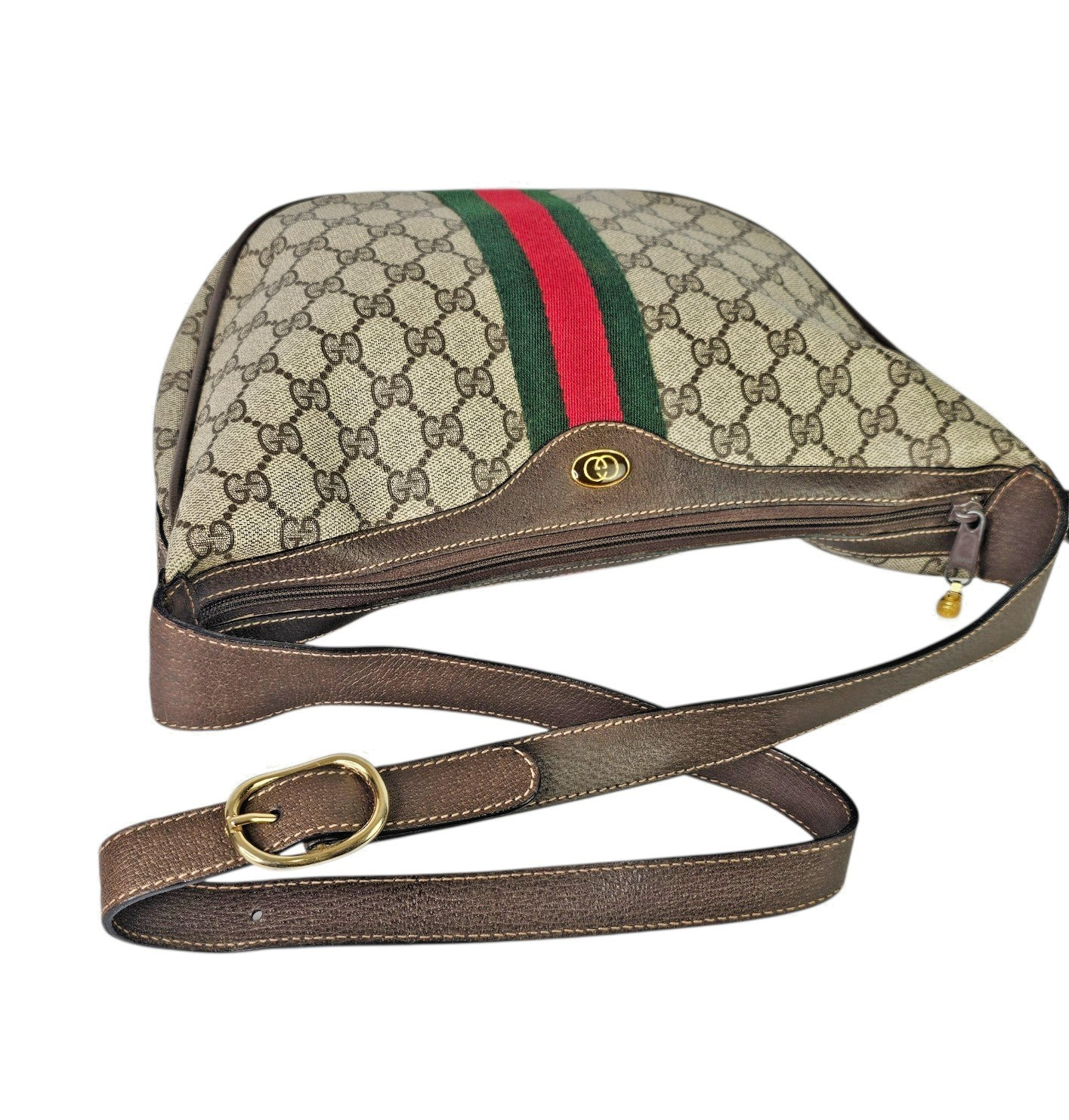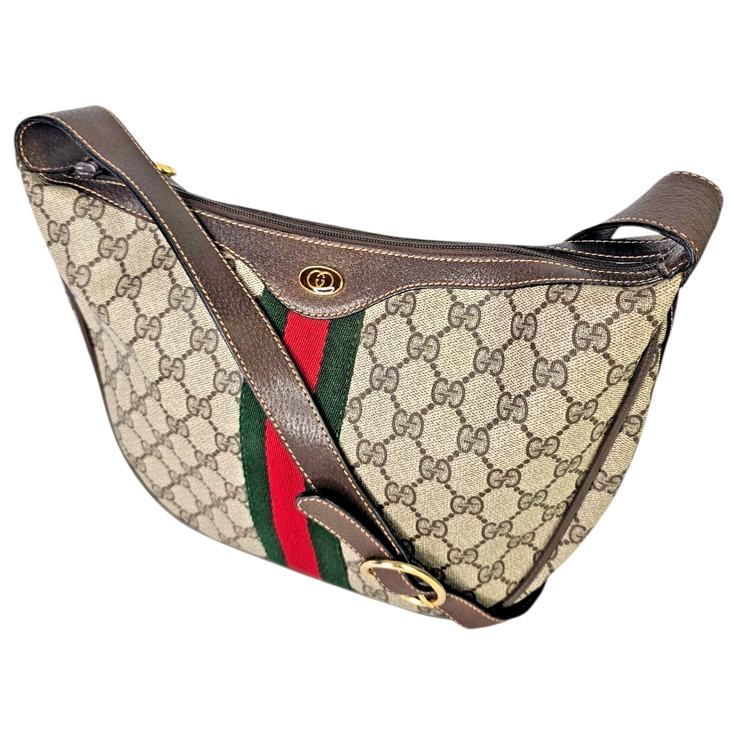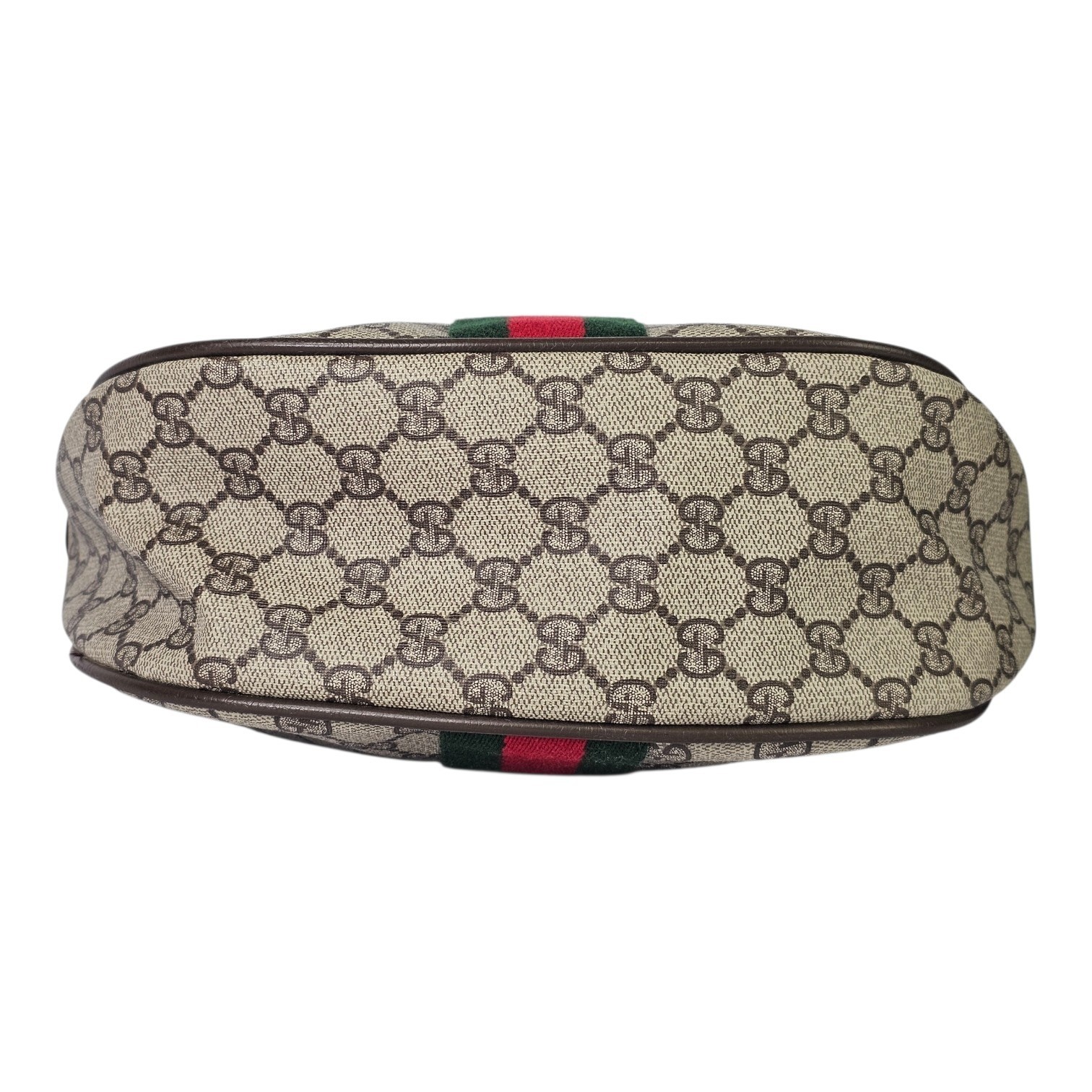 This original vintage Gucci Ophidia Half Moon Hobo is crafted in classic brown GG coated canvas with rich leather trim and gold tone hardware, featuring the iconic red and green Web stripe running vertically down the center of both the front and back. This is the true early made in Italy version of the Ophidia that has since been reissued, making it especially desirable for collectors and vintage Gucci lovers.