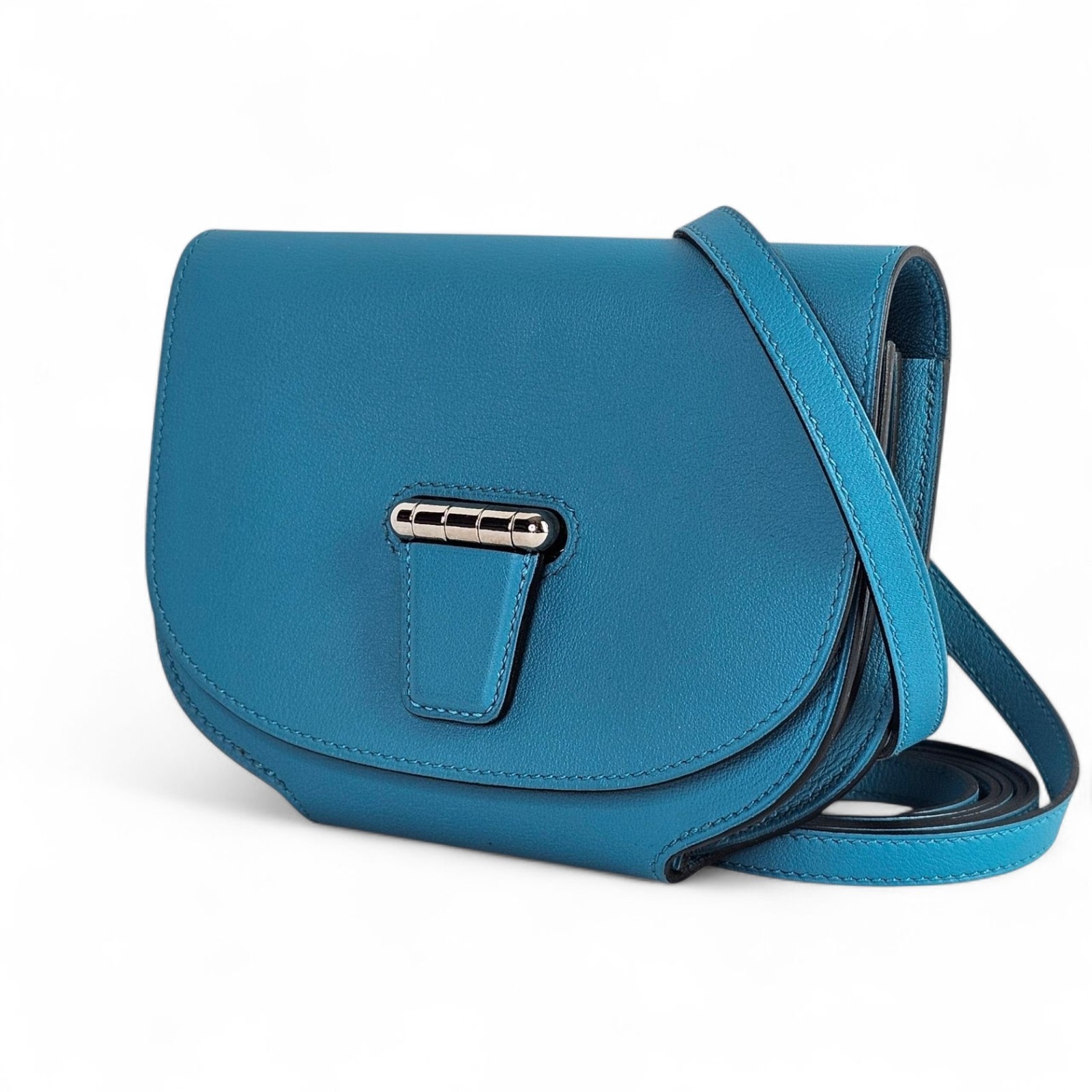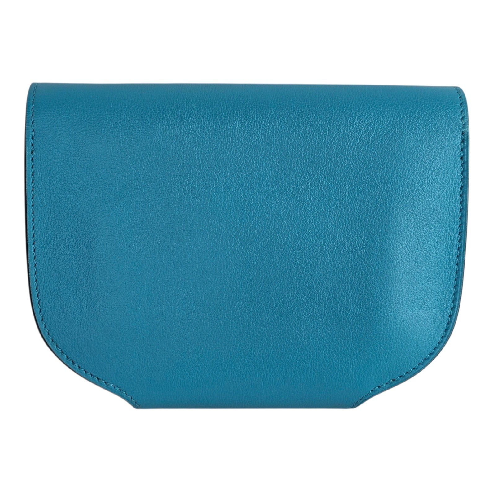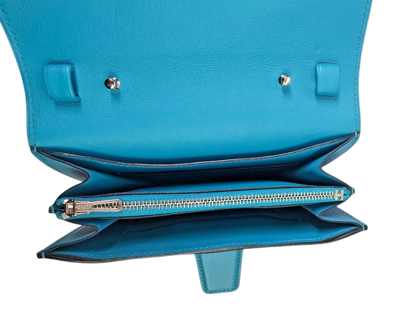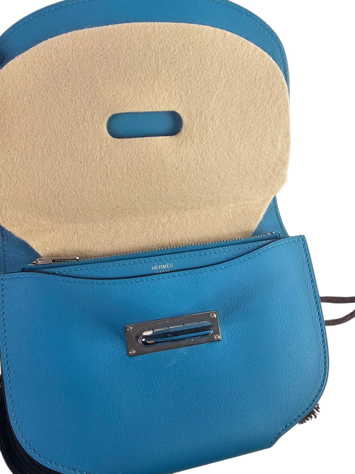 Crafted from supple Swift calfskin leather in a vibrant turquoise blue, the bag has a soft yet structured silhouette with a smooth, refined grain. The front flap is secured with the distinctive Hermès leather switch lock and palladium-plated hardware, offering understated luxury. A slim matching strap provides hands-free crossbody styling and keeps the design sleek and minimal.