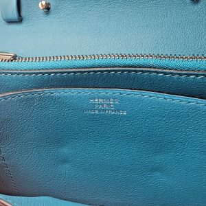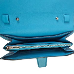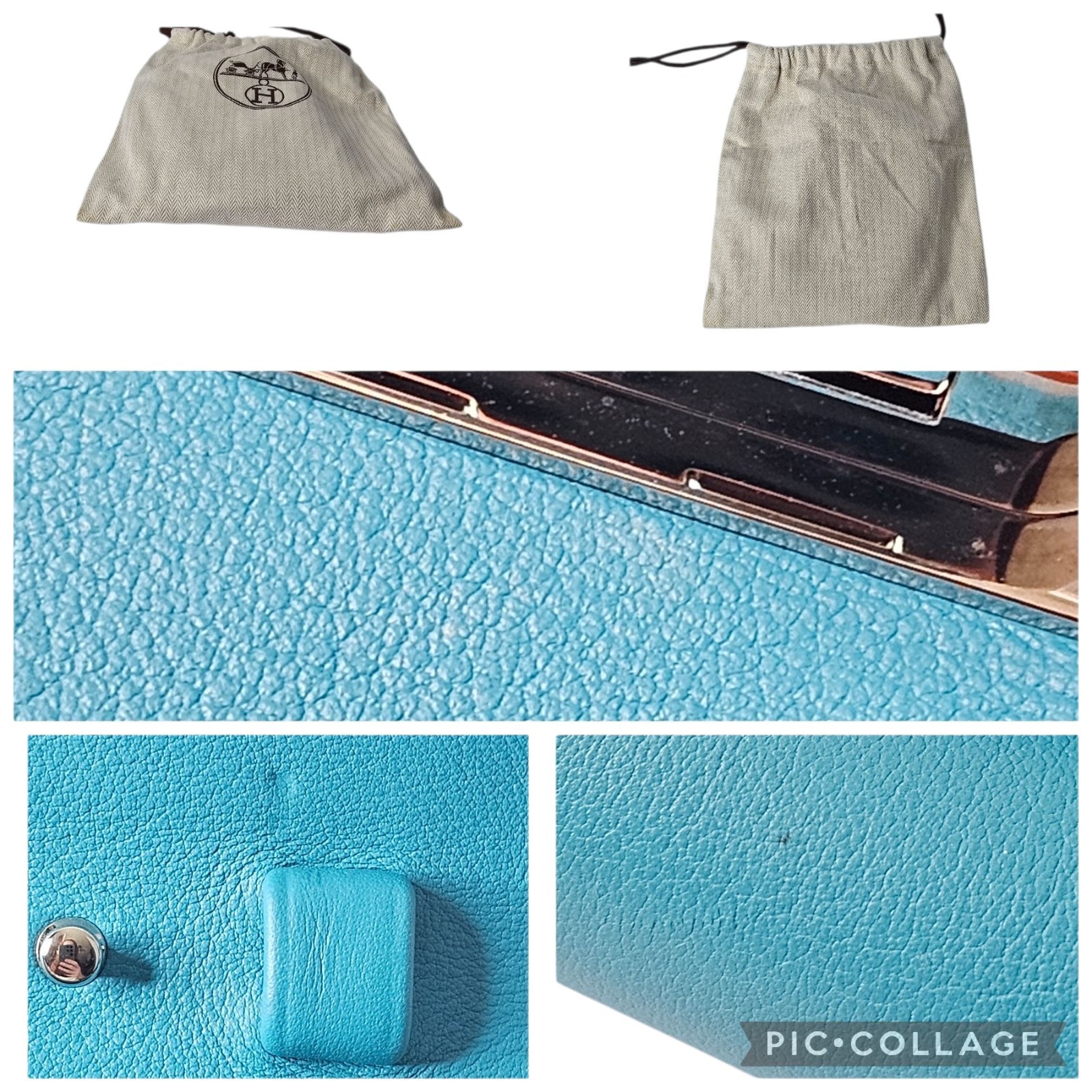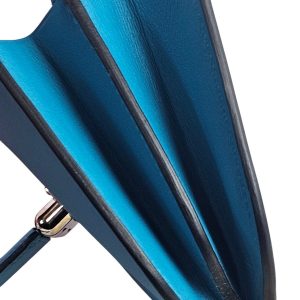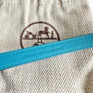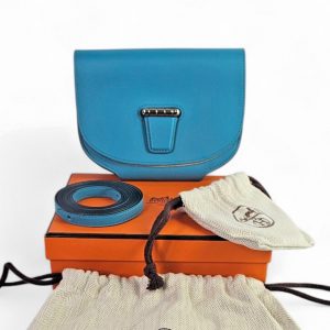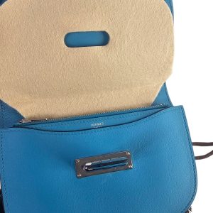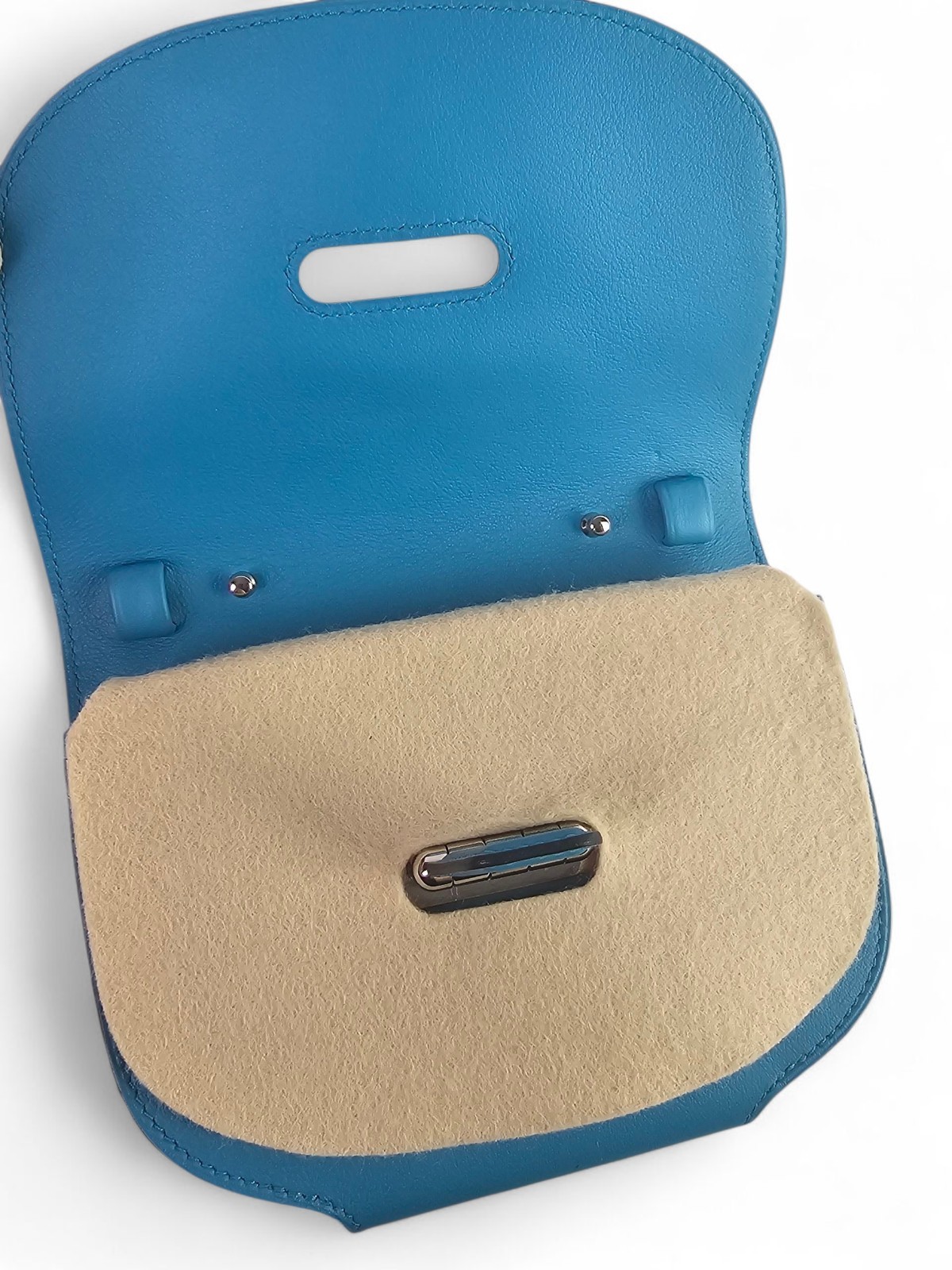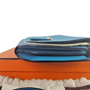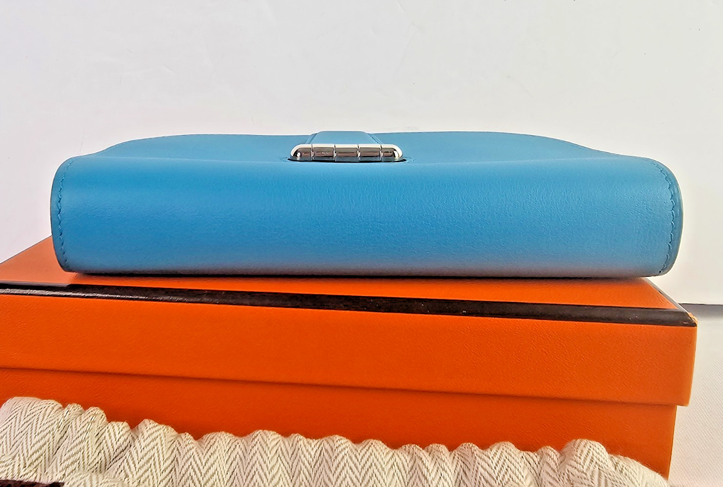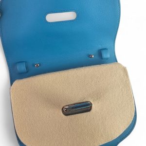 Crafted from supple Swift calfskin leather in a vibrant turquoise blue, the bag has a soft yet structured silhouette with a smooth, refined grain. The front flap is secured with the distinctive Hermès leather switch lock and palladium-plated hardware, offering understated luxury. A slim matching strap provides hands-free crossbody styling and keeps the design sleek and minimal.