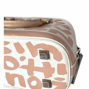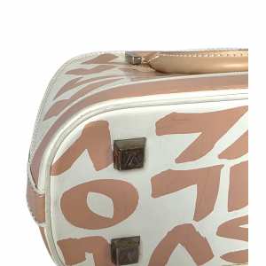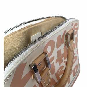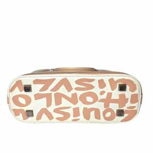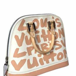 A true collector’s piece, this Louis Vuitton Alma MM in white leather with tan graffiti is from the coveted Stephen Sprouse x Marc Jacobs collaboration. This limited-edition bag reinterprets the classic Alma silhouette with bold graffiti lettering across smooth calfskin leather — including the top handles — for a modern, street-luxe look.