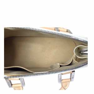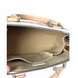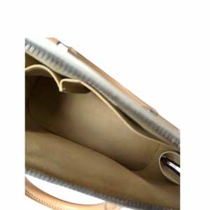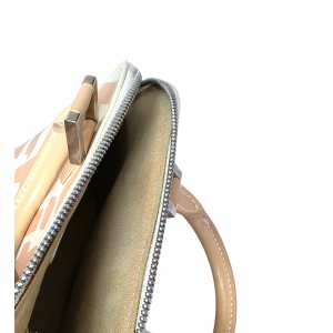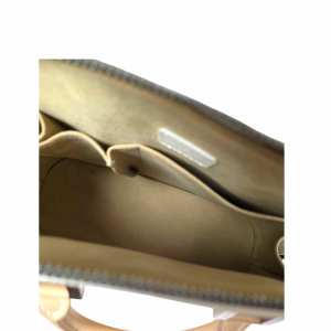 Interior: Lined in beige microfiber. Minor staining and residue marks along the interior top lining near the zipper.