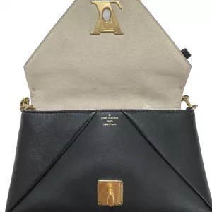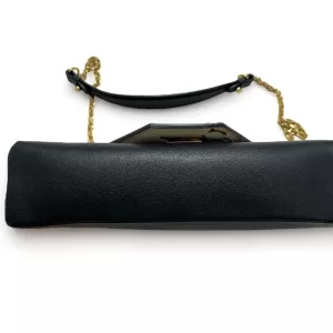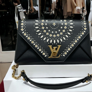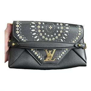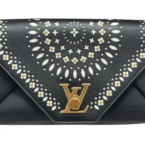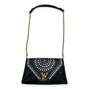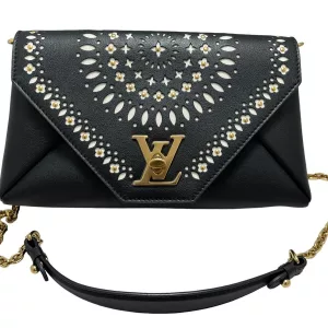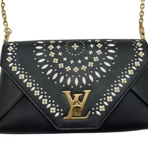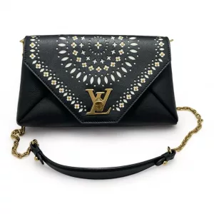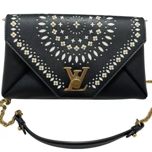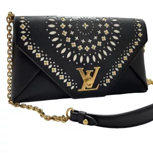 This chain bag will get you many compliments! Small and elegant to be worn on the shoulder or remove the strap for hand carry clutch style. It features buttery soft black leather and a white perforated leather pattern design of flowers with golden studs inside the flowers and leaves surrounding the flowers in a circular pattern on the front. Truly a masterpiece. All hand crafted with the utmost attention to detail. It features an eye-catching oversized golden LV twist closure. It has beige soft Alcantara lining. A runway worthy bag.
