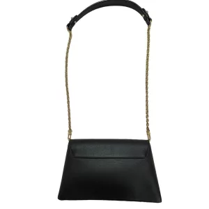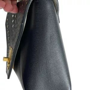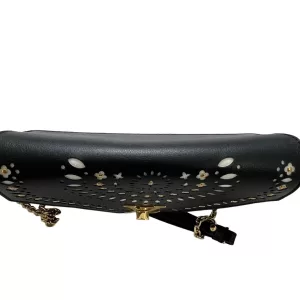 - Crafted in black leather with perforated flower studded white accents to the front of the flap.