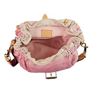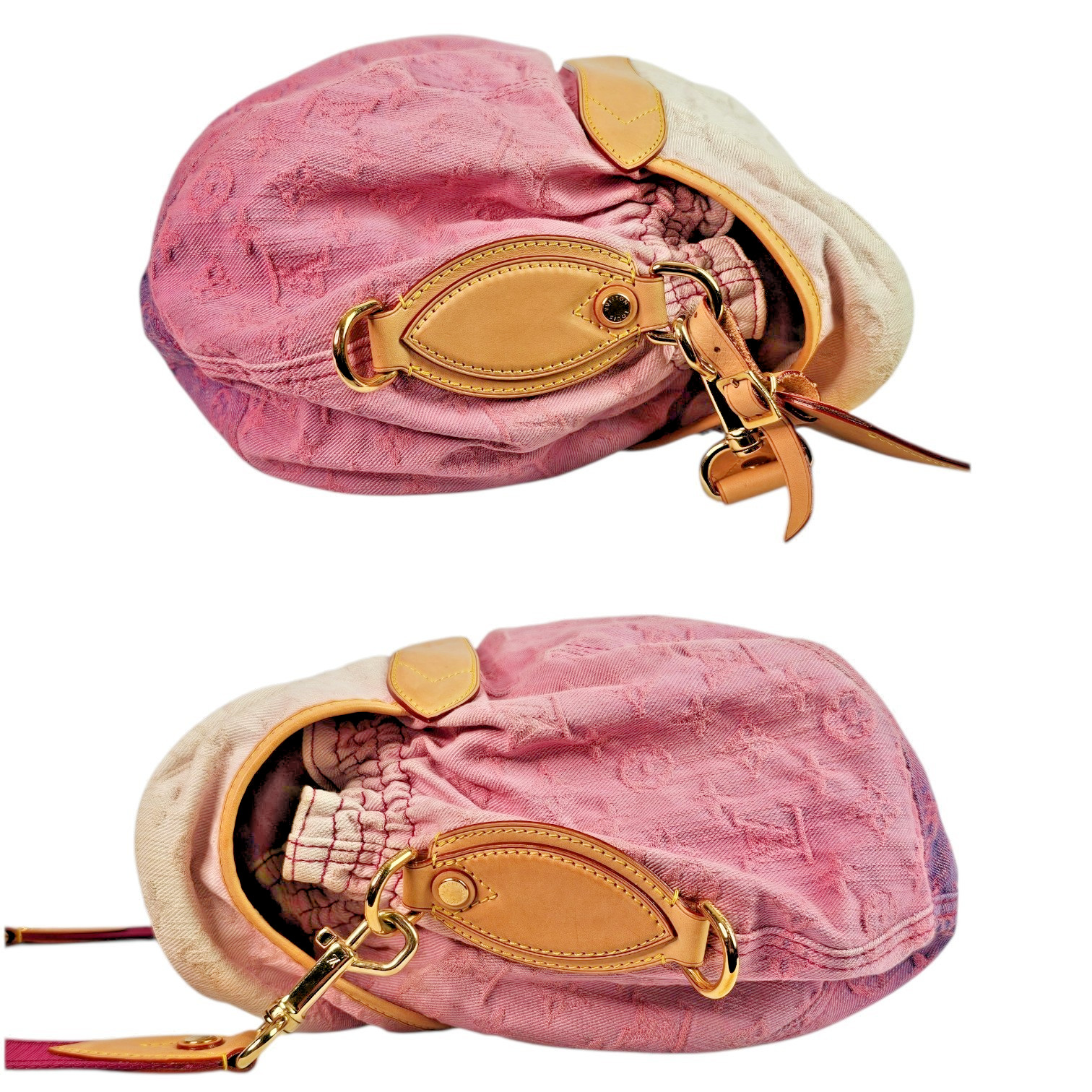 This stylish Louis Vuitton Sunshine Messenger is crafted in gradient monogram denim transitioning from white to pink, giving it a fresh and eye catching look. The bag features a brightly colored adjustable nylon shoulder strap, vachetta cowhide leather trim, and polished brass hardware. The front flap opens to a soft powder blue microfiber interior with patch pockets, making it both functional and chic for everyday wear.
