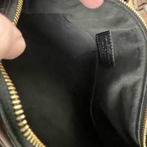 The bag features tall black leather strap top handles for comfortable carrying, while polished brass hardware, including a large zipper pull, adds a refined touch. The black fabric interior is thoughtfully designed with patch pockets for organization, ensuring you can carry your essentials with ease and style.