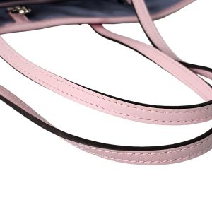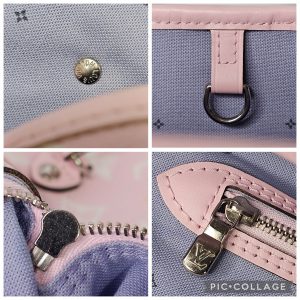 The bag is finished with pink leather shoulder straps and side cinch cords, complemented by silver tone hardware. The open top reveals a spacious blue mini monogram printed textile interior with a hanging zip pocket. Included is the matching removable zip pouch, perfect for essentials.