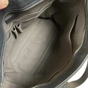 Inside, the bag is lined with dark grey fabric, providing a rich contrast to the exterior. The spacious interior features two large patch pockets, perfect for organizing essentials like a phone, wallet, or small tablet, making it ideal for daily use or travel.