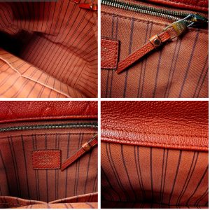 This bag is in great, clean condition with some normal slight wear. The interior is clean with only minor, light signs of use. The body retains its saturated color and is well maintained, with minor scuffs and nicks to the leather in certain areas. Hardware shows light scuffs and slight tarnishing consistent with gentle use. Bottom base feet show some scuffs and scratches. Edge trim and handles may have light normal wear. Interior is clean without detectable scents, though for eBay purposes it may have a slight storage scent. Overall, the bag is strong, supple, and well cared for.