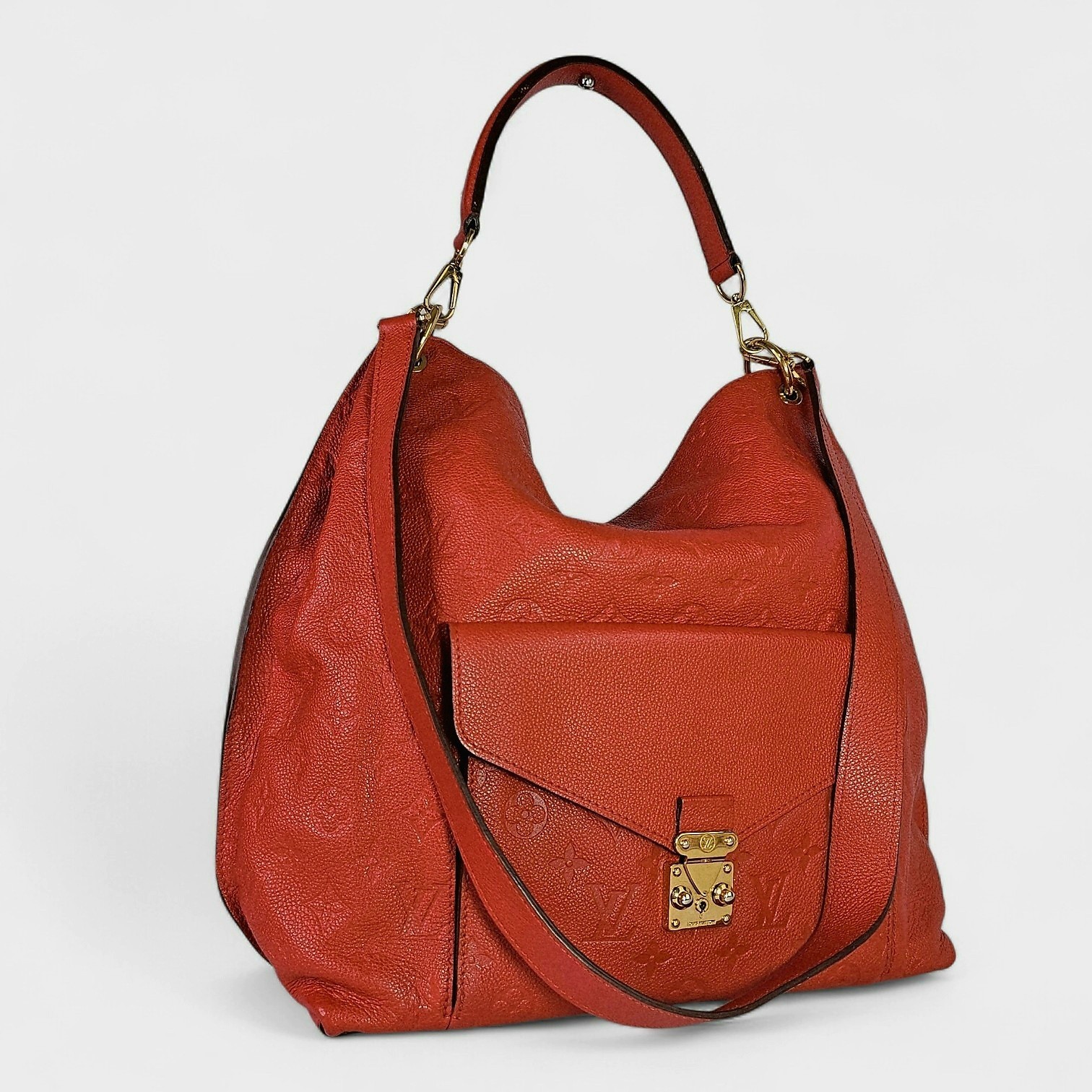 This elegant Louis Vuitton Hobo Métis in the vibrant Orient Red/Orange shade is crafted from supple embossed Monogram Empreinte leather. Its soft, slouchy silhouette can be worn slouched down in the center for a relaxed look or more structured like a tote, offering versatile styling options. The shiny gold-toned hardware and signature front S-lock pocket add refined detail while maintaining functionality. It includes a removable short handle and an adjustable, detachable long leather strap for shoulder or crossbody wear.