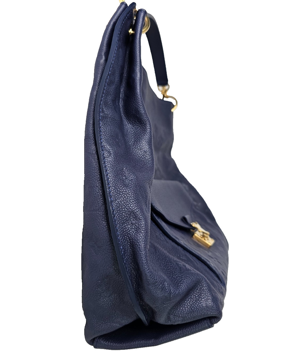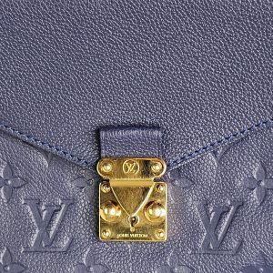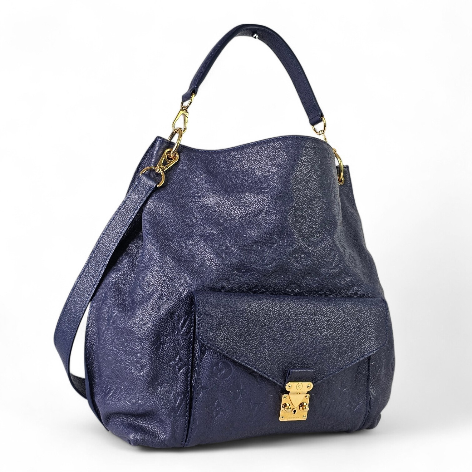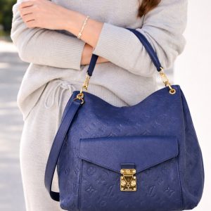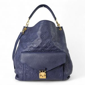 This elegant Louis Vuitton Hobo Métis in the beautiful Infini blue shade is crafted from supple embossed Monogram Empreinte leather. The soft, slouchy silhouette is complemented by shiny gold toned hardware and the signature front S lock pocket, giving it a refined yet functional look. It includes a removable short handle and an adjustable, detachable long leather strap for versatile shoulder or crossbody wear.