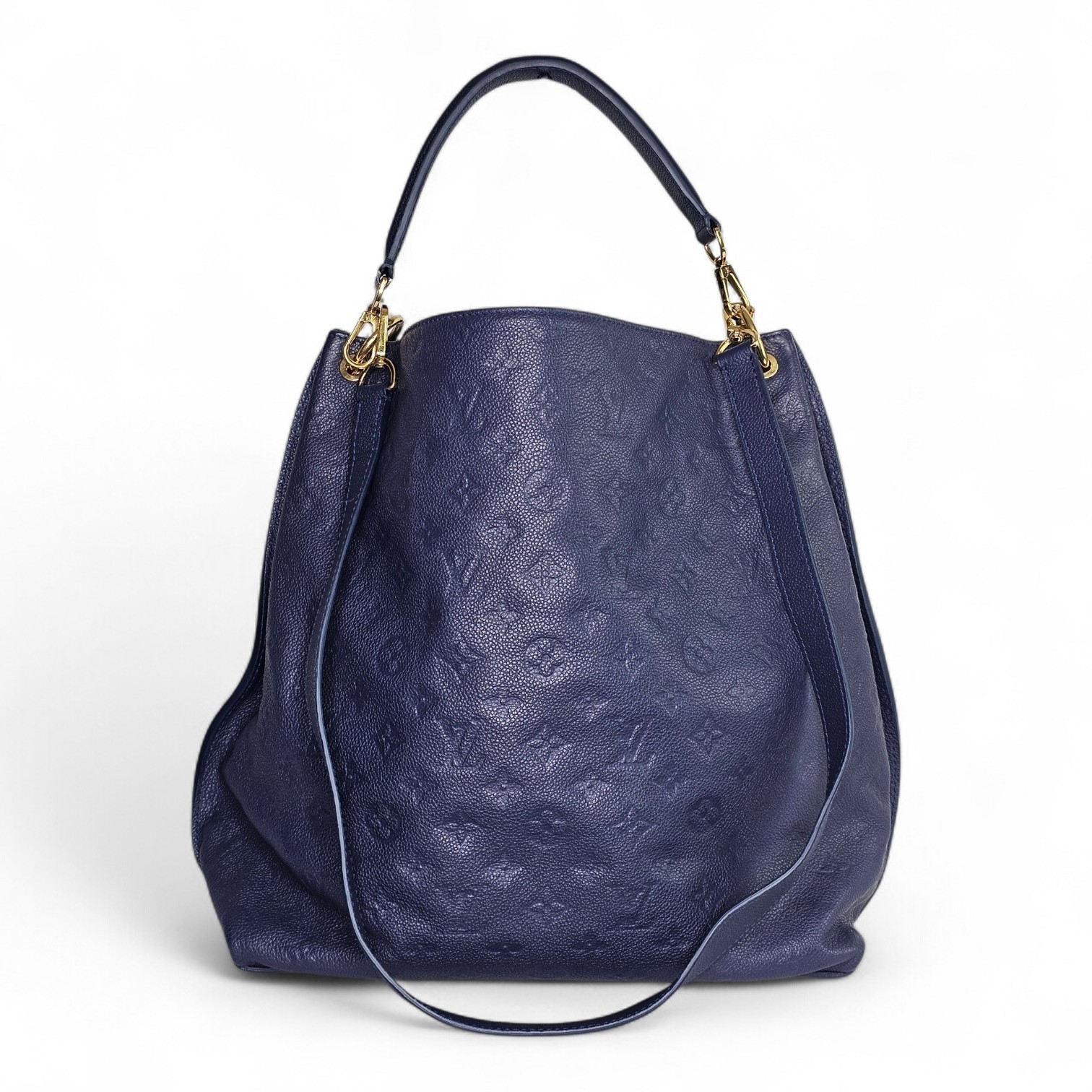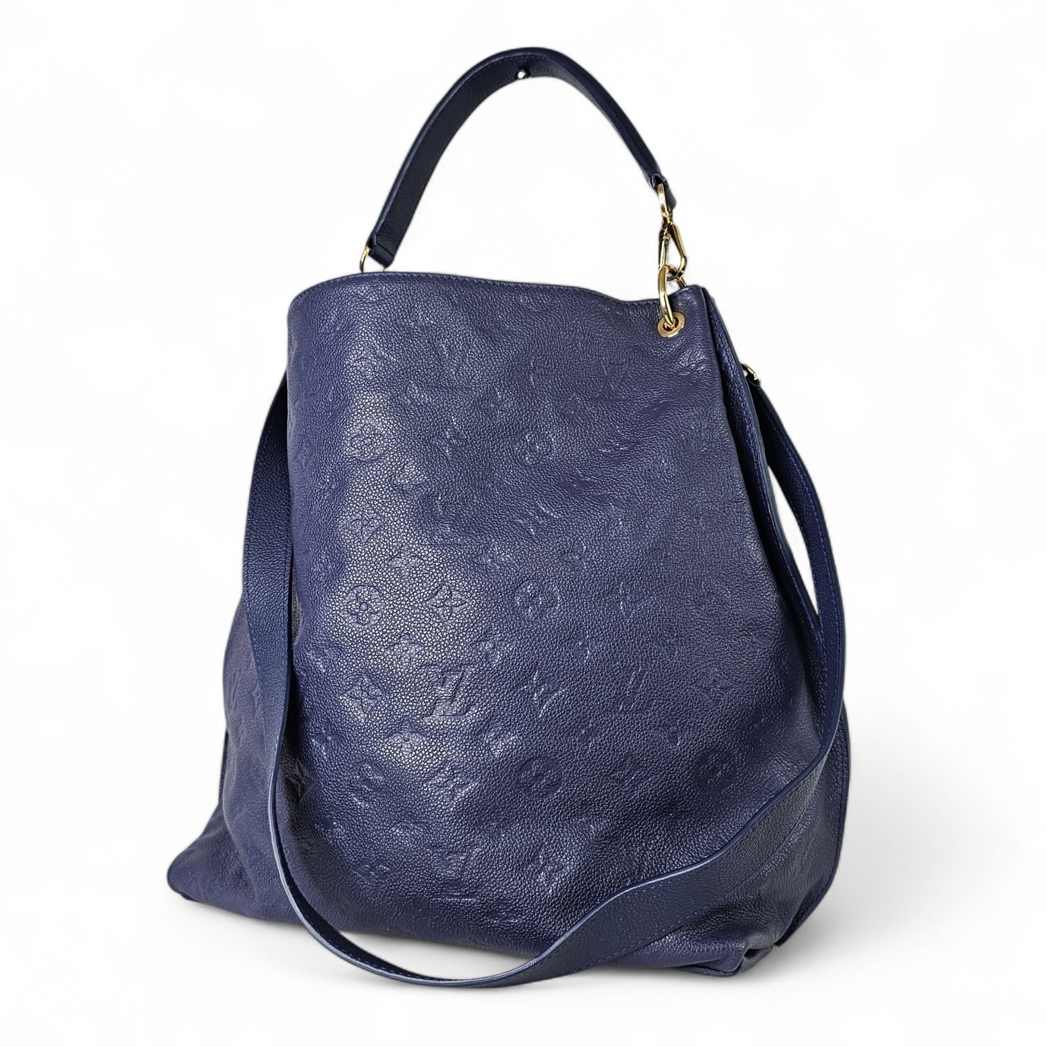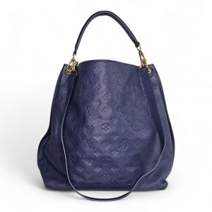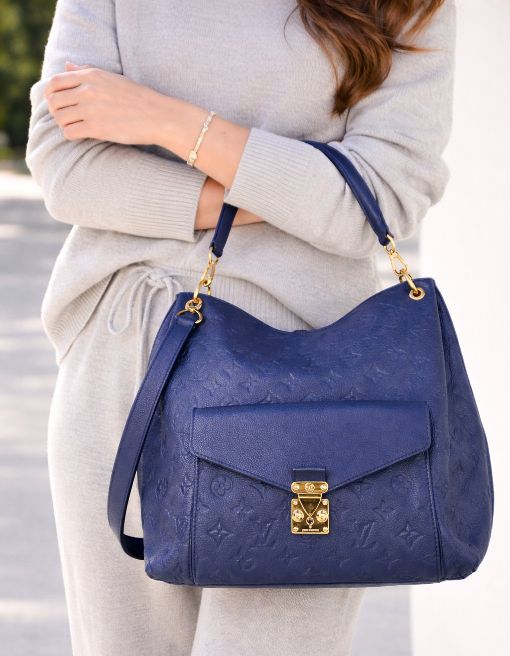 This elegant Louis Vuitton Hobo Métis in the beautiful Infini blue shade is crafted from supple embossed Monogram Empreinte leather. The soft, slouchy silhouette is complemented by shiny gold toned hardware and the signature front S lock pocket, giving it a refined yet functional look. It includes a removable short handle and an adjustable, detachable long leather strap for versatile shoulder or crossbody wear.