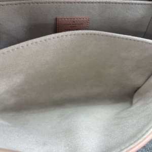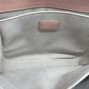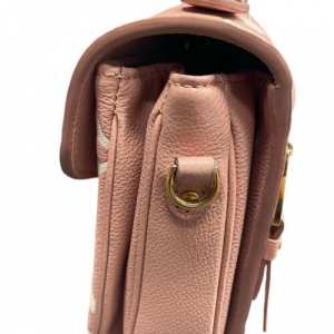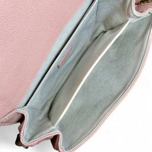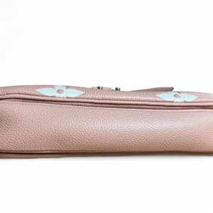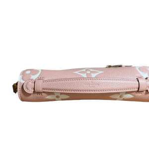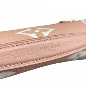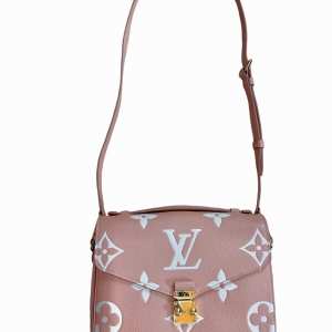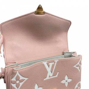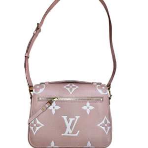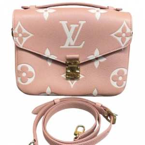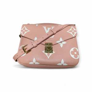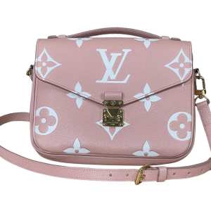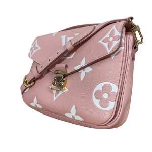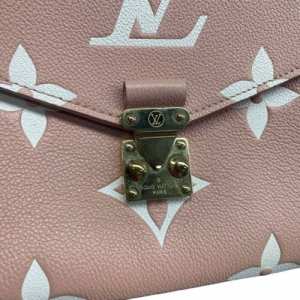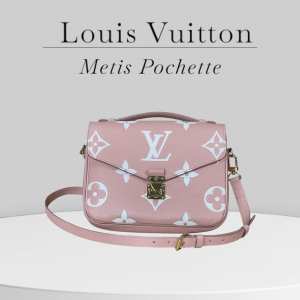 The Louis Vuitton bag in the image is a Louis Vuitton Pochette Métis in pink. It has a soft, structured silhouette made from Louis Vuitton’s iconic Monogram leather, featuring large, bold white monogram patterns that stand out against the pink leather background. The bag is adorned with a gold-tone S-lock clasp in the center for a secure closure, which adds a touch of luxury to the overall design.