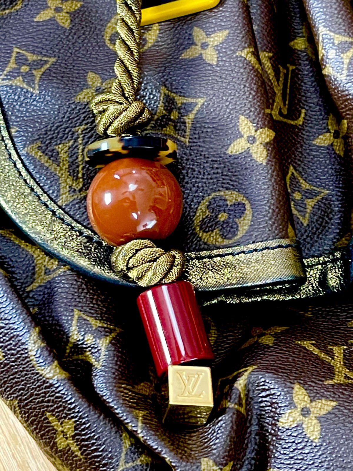 The satin rope drawstring, adorned with gold-tone and lacquered beads, evokes the artistry of tribal jewelry, adding a touch of bohemian luxury. The metallic leather trim lends a subtle shimmer, while the supple vachetta leather strap ensures both comfort and elegance.