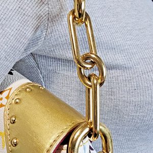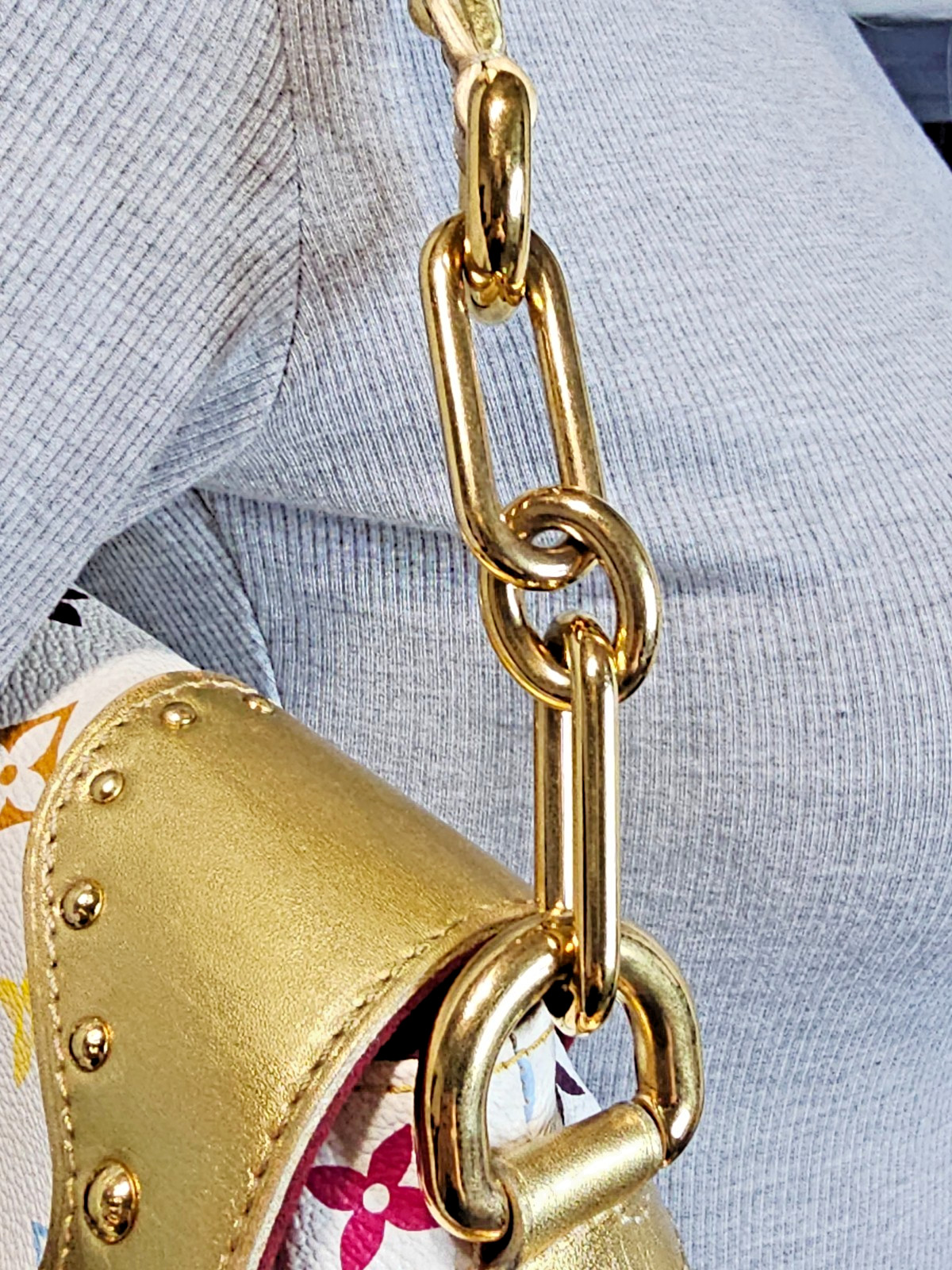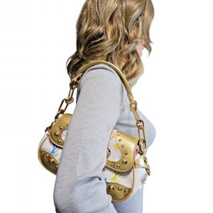 A beautiful vintage piece from Louis Vuitton’s 2008 Collection. Crafted from white Multicolore Monogram coated canvas with metallic gold leather trim, oversized brass hardware, and studded accents. Features a structured shape, chunky gold chain handle, and a front push-lock closure.