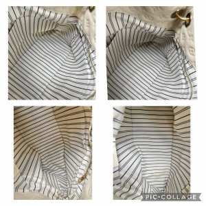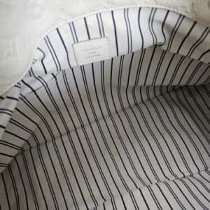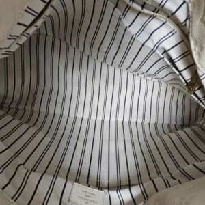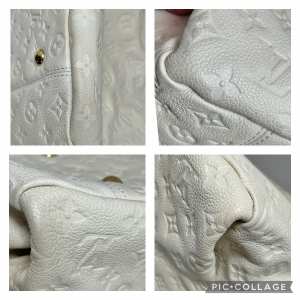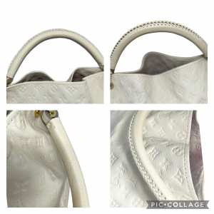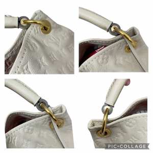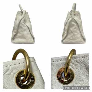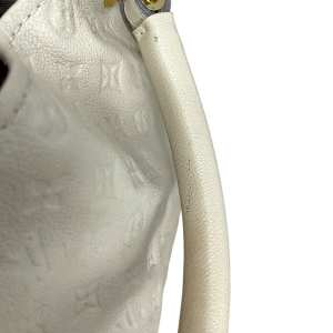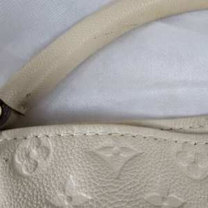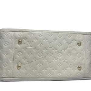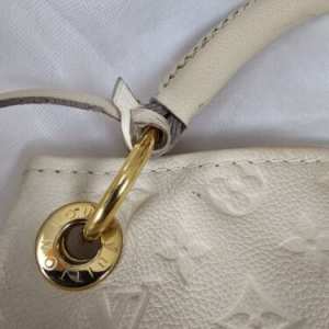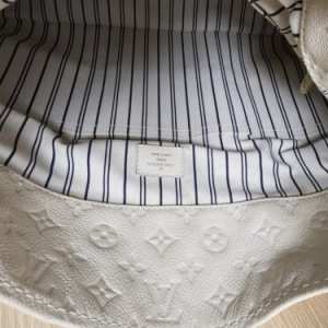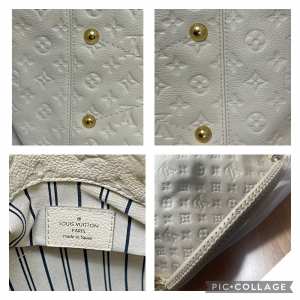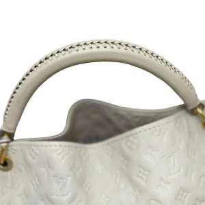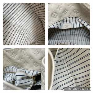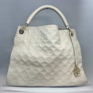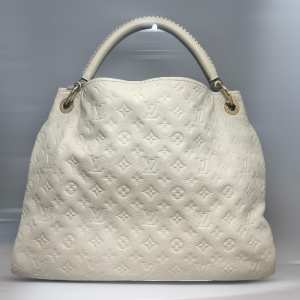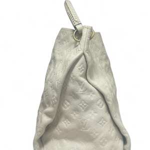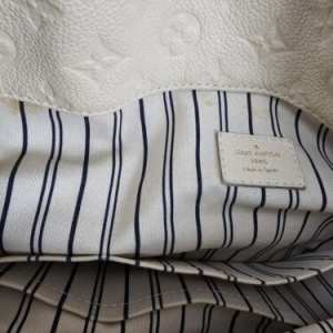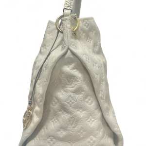 This gorgeous Louis Vuitton monogram embossed leather Artsy in off white (Neige) is the perfect accessory to accompany most of your attire. Adds a fresh and neutral touch to most clothing choices. Features a comfortable leather looping shoulder strap with woven detailing and polished golden brass hardware pieces that are engraved with Louis Vuitton. The top has a wide opening to a spacious white and navy blue striped fabric interior with a side zipper pocket and on the other side patch pockets. The leather has the signature Louis Vuitton monogram and will keep you stylish for years to come.