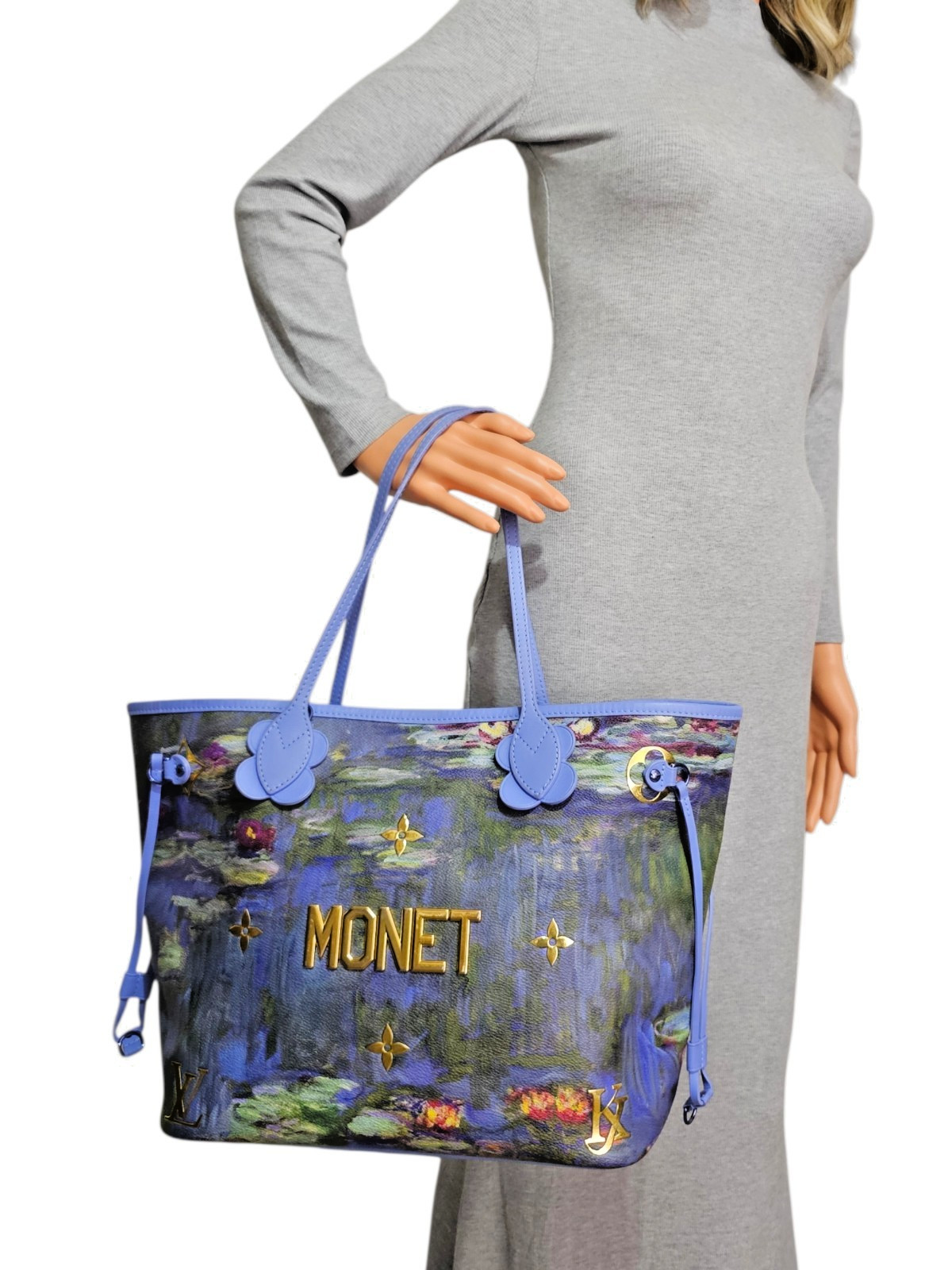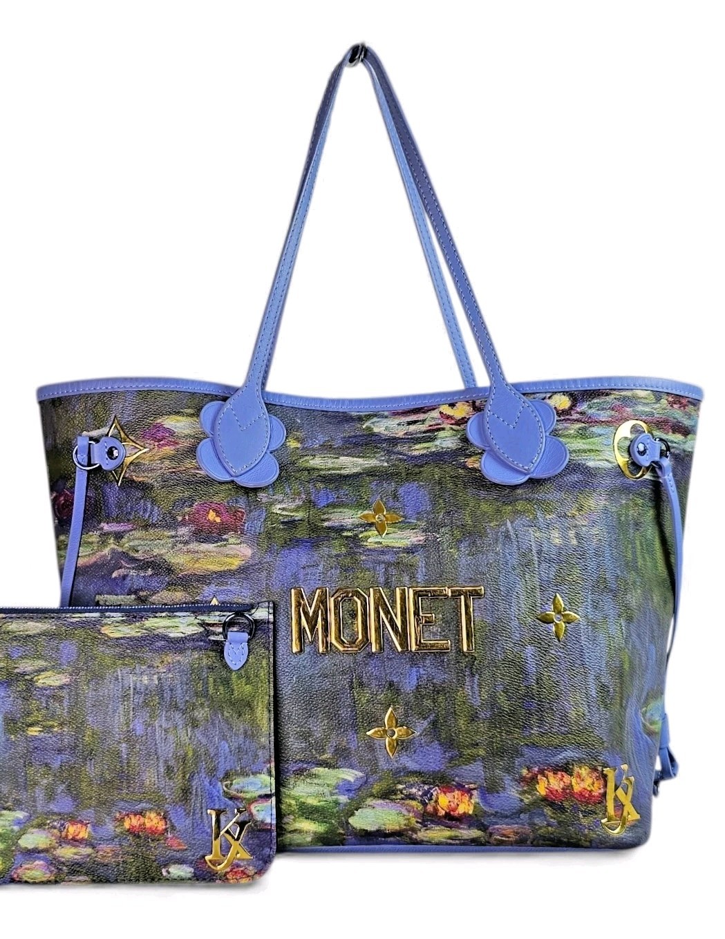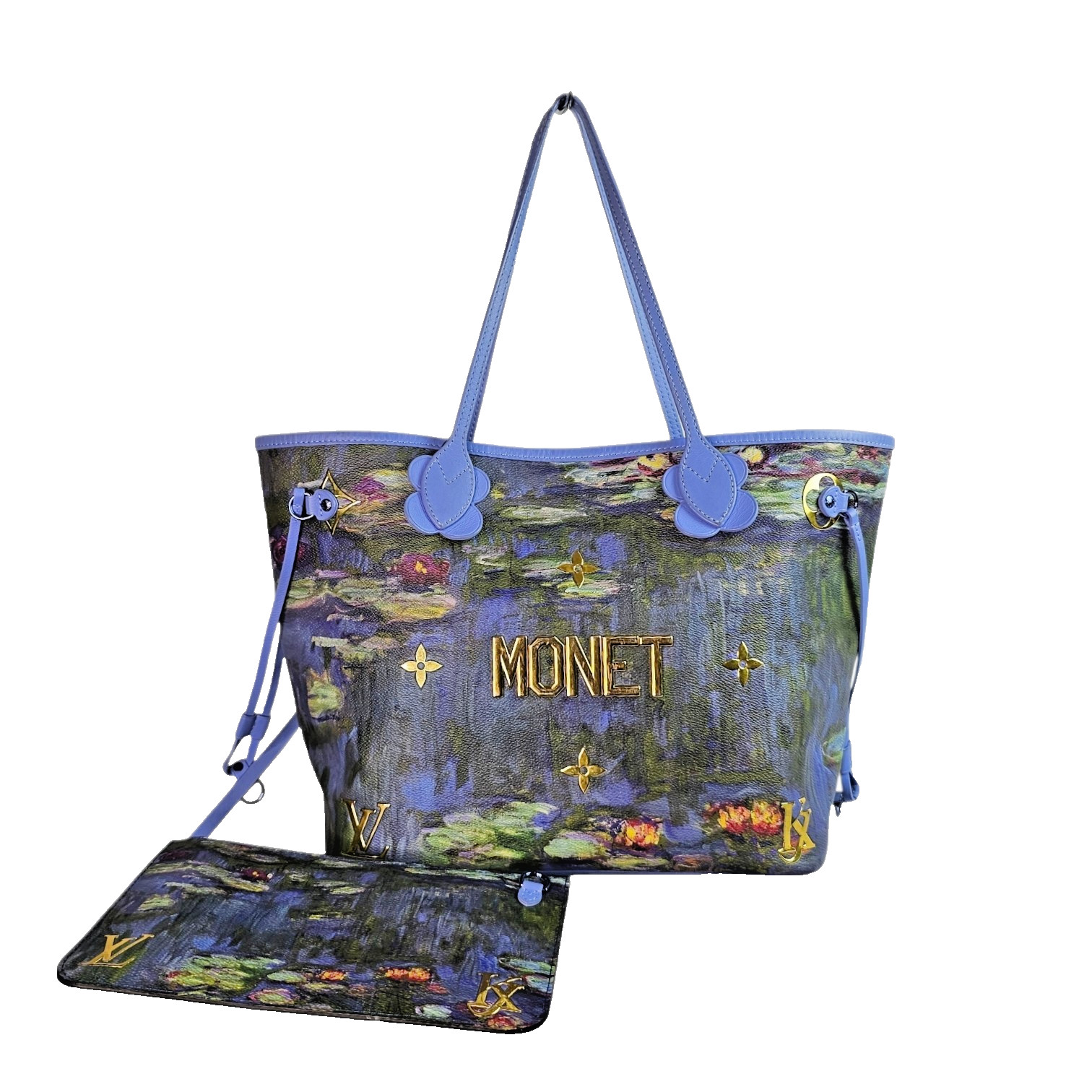 This iconic tote from the Louis Vuitton Masters Collection features a stunning rendition of a Claude Monet pond painting printed on coated canvas. The design is finished with light blue calfskin leather trim, smooth leather shoulder straps, signature gold Monogram flower details, and bold reflective metallic letters spelling Monet on the front.