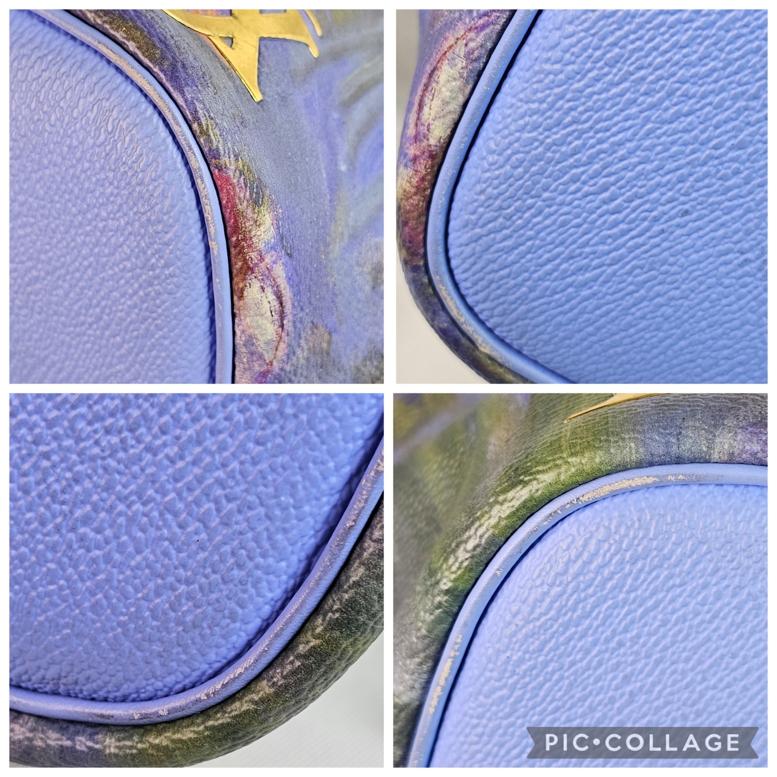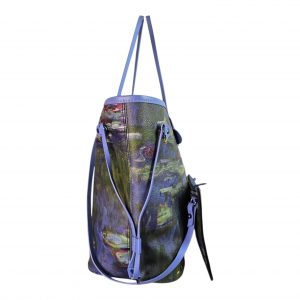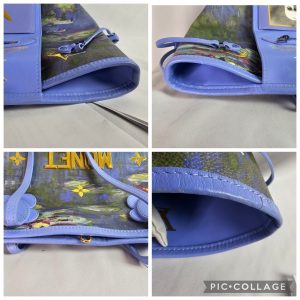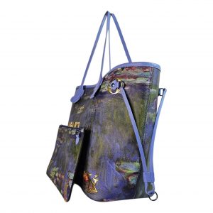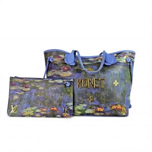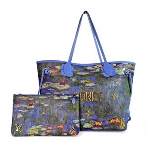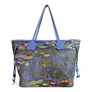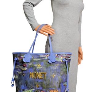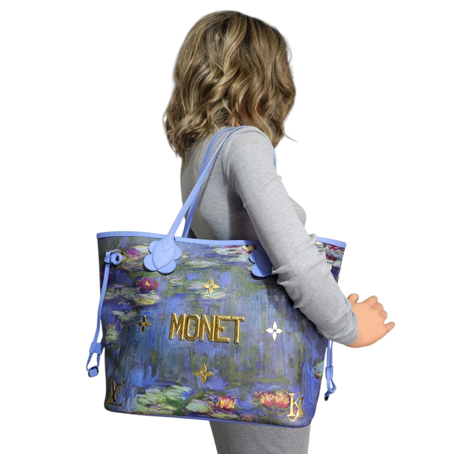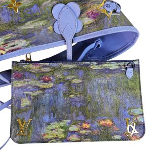 This iconic tote from the Louis Vuitton Masters Collection features a stunning rendition of a Claude Monet pond painting printed on coated canvas. The design is finished with light blue calfskin leather trim, smooth leather shoulder straps, signature gold Monogram flower details, and bold reflective metallic letters spelling Monet on the front.