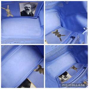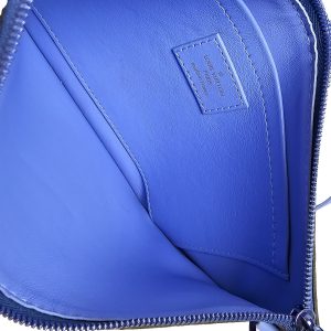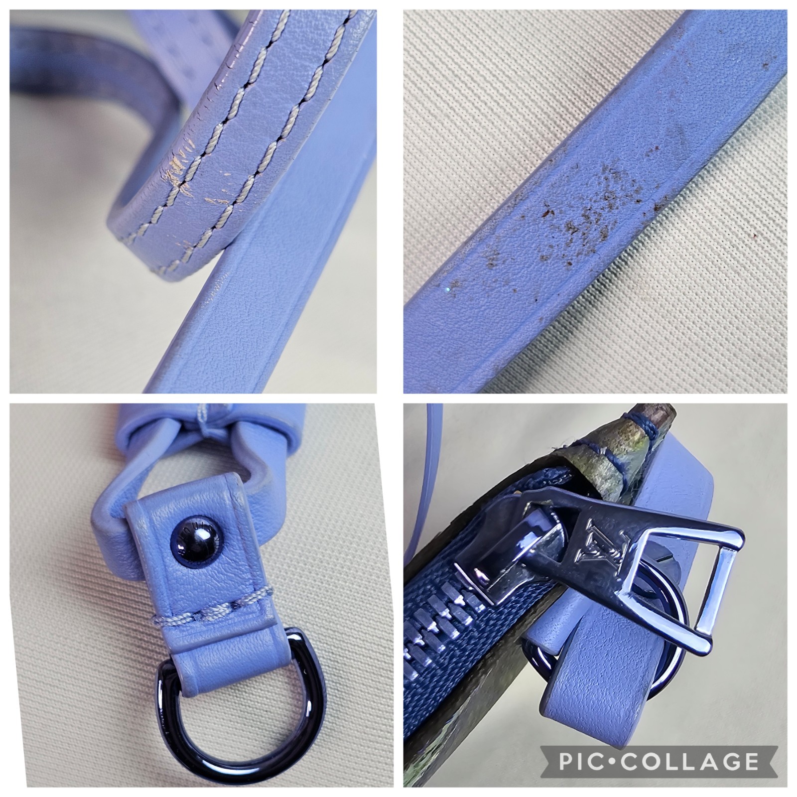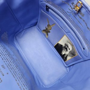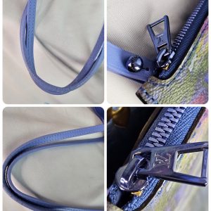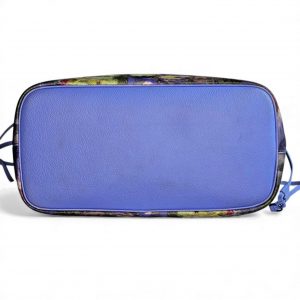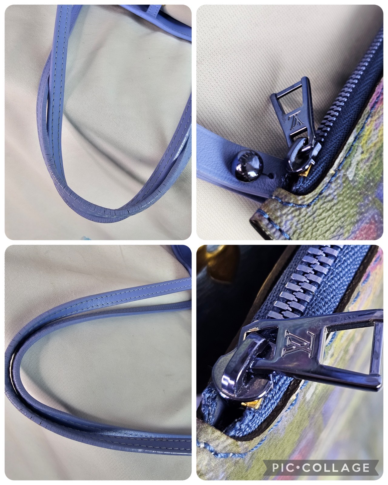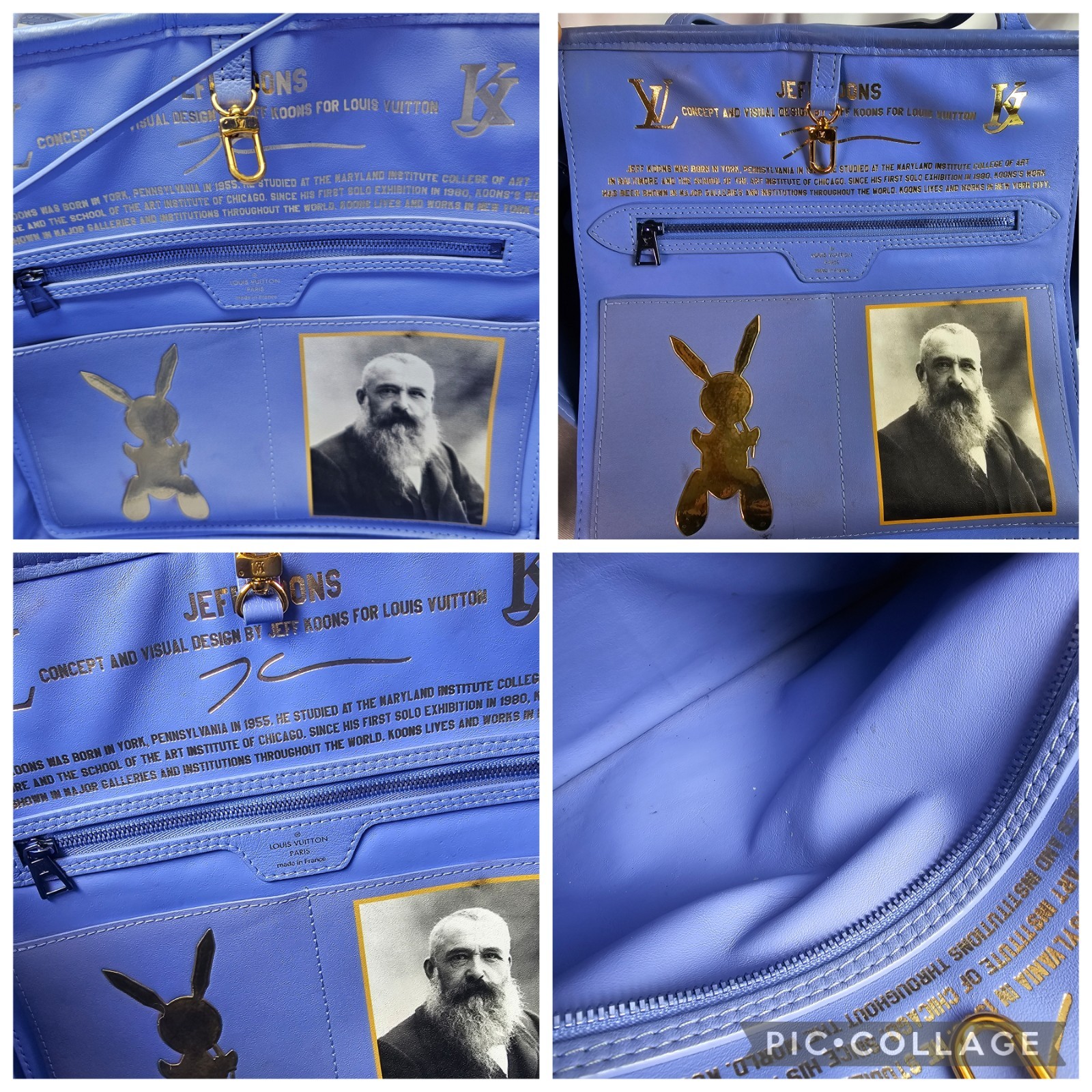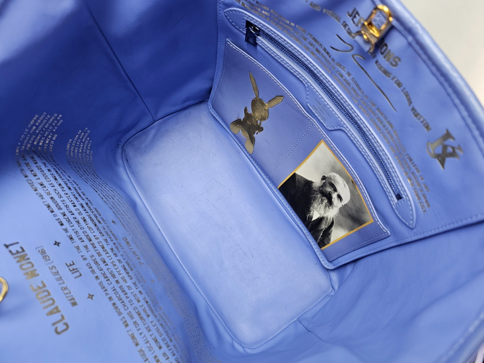 The top opens to a light blue leather interior with a hanging zip pocket and a removable pochette. The interior is beautifully detailed with printed artwork and gold text describing this celebrated artistic collaboration. Spacious, recognizable, and wearable, this Neverfull is a standout piece for everyday use and a must have for collectors of Louis Vuitton art collaborations.