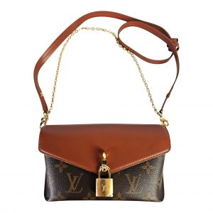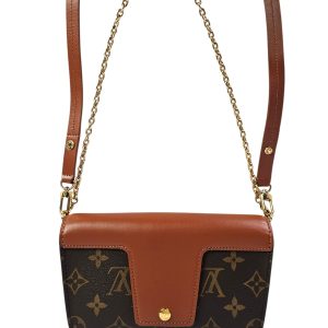 This compact and structured Louis Vuitton bag is crafted from signature Monogram coated canvas with a rich brown cowhide leather front flap. It features a distinctive press padlock closure and a removable brown leather shoulder strap for versatile wear. The front flap opens to a brown microfiber interior with a patch pocket, making it both functional and refined.