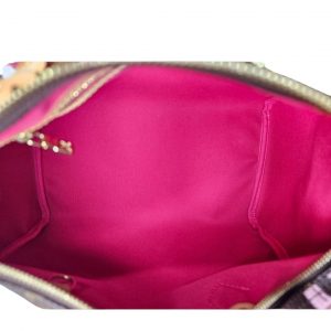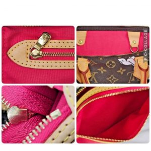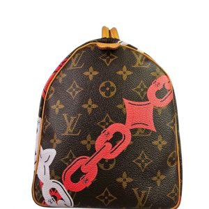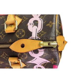 The model number for the Louis Vuitton Monogram Bay Speedy 30 in Rose Ballerine and Poppy is M41989. This limited edition bag was part of Louis Vuitton’s Spring-Summer 2016 collection, known as the “Tropical Journey” line, and features a distinctive chain flower print on the classic monogram canvas. The bag is crafted with vachetta cowhide leather trim and a vibrant dark pink fabric interior.