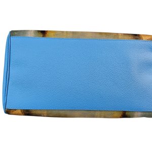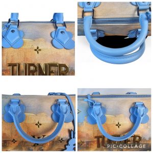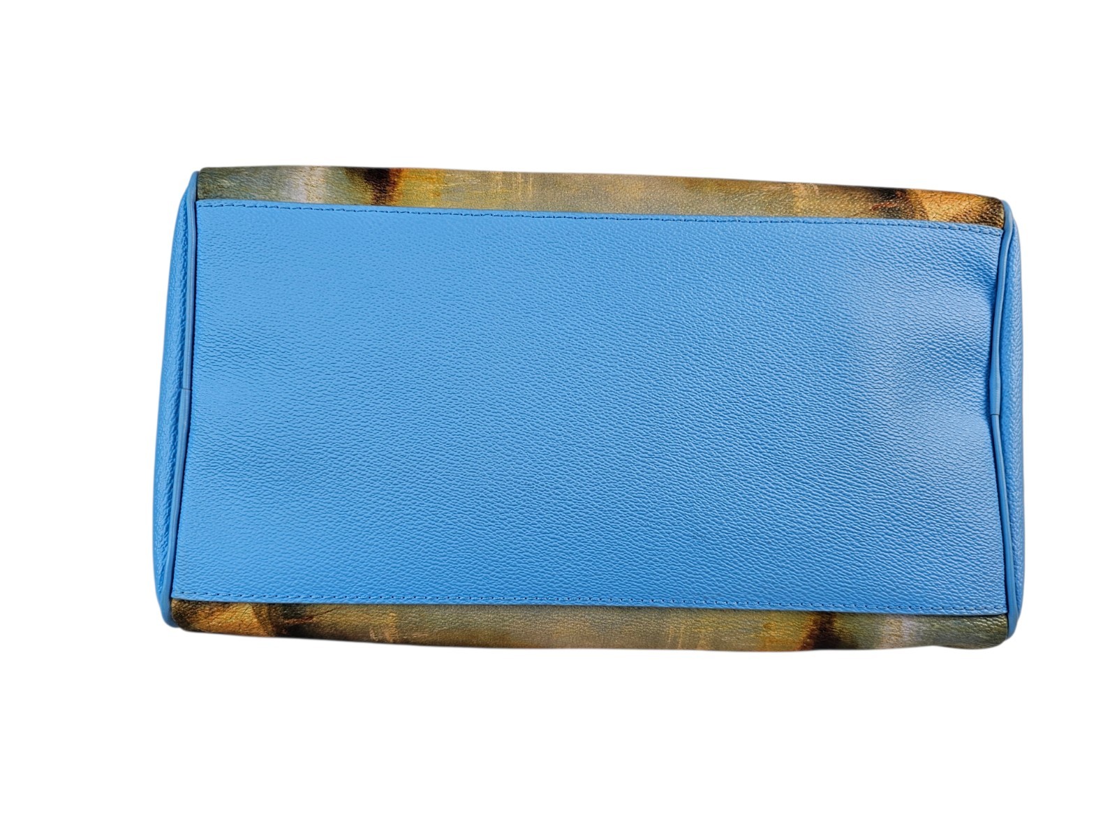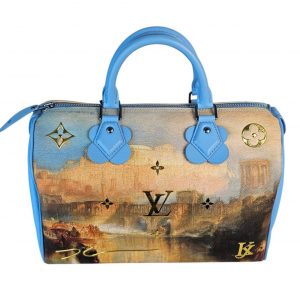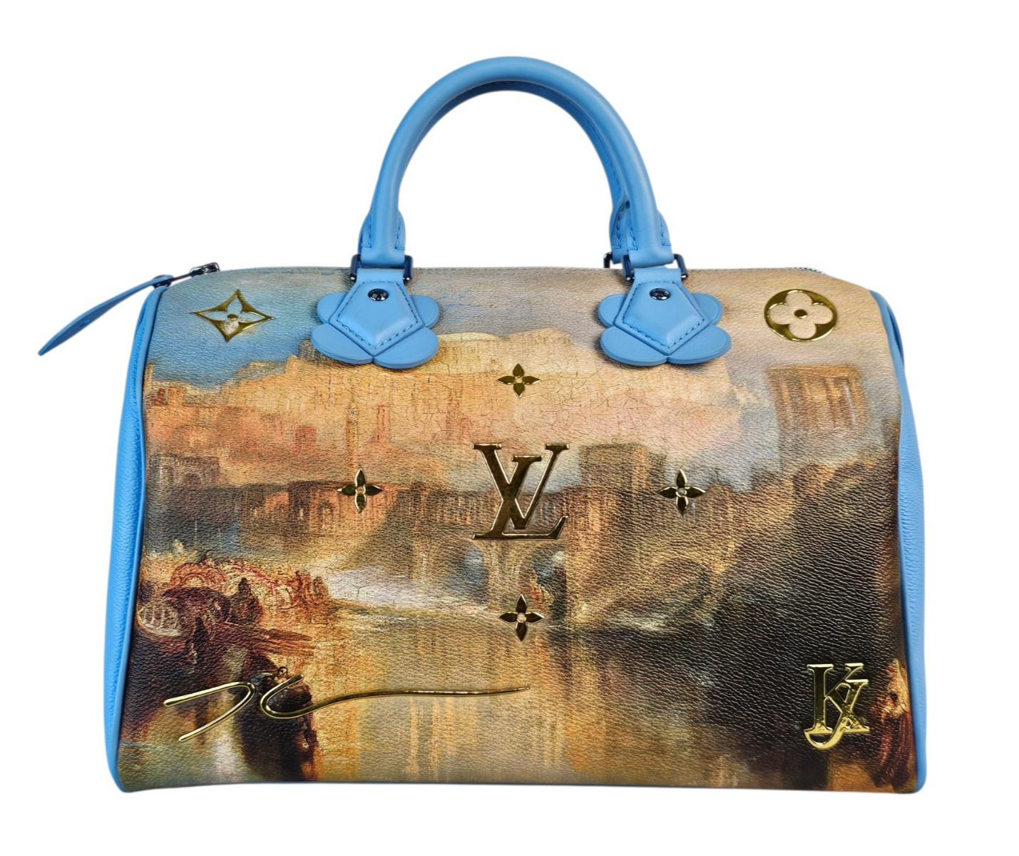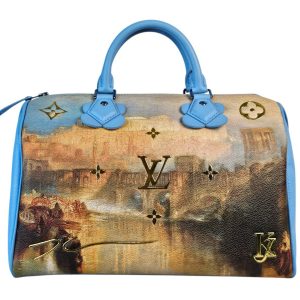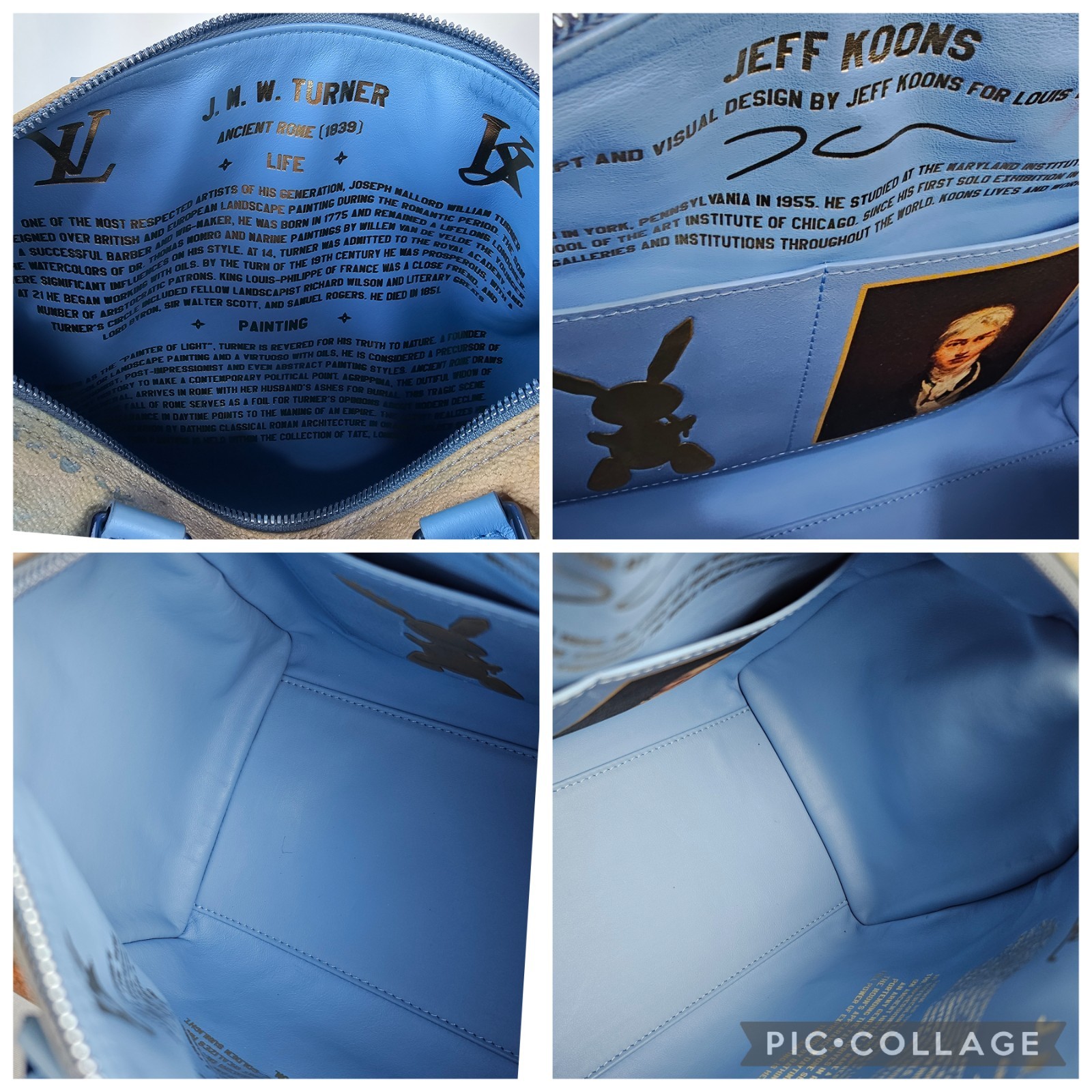 Limited Edition from the 2017 Jeff Koons Collection. Multicolor coated canvas with pale blue leather trim, mixed hardware, dual rolled handles, and J. M. W. Turner’s Ancient Rome motif throughout. Features gold-tone embellishment at the front, metallic gold-tone leather monogram serti details, and a tonal calfskin interior with dual slit pockets. Zip closure at top.