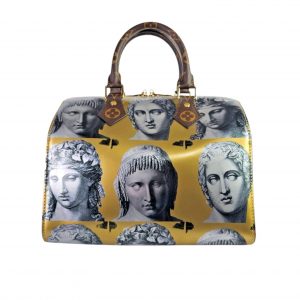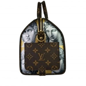 This exquisite Louis Vuitton x Fornasetti Speedy Bandoulière 25 is a rare, collectible piece that blends Louis Vuitton’s timeless Monogram canvas with Fornasetti’s artistic architectural motifs. The result is a striking fusion of fashion and art, highlighted by gold-tone hardware and intricate detailing throughout.