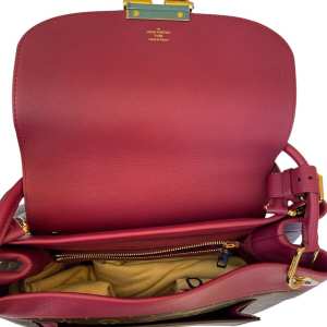 This bag features tall, rich Aurore-colored burgundy rolled leather top handles with stylish D-ring clasps and leather anchors. The flap opens with a polished brass hinge to reveal a partitioned microfiber interior with zipper pockets, patch pockets, and a central zipper compartment.