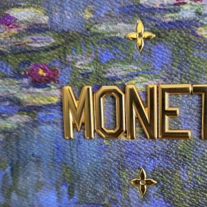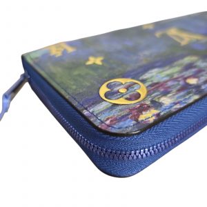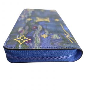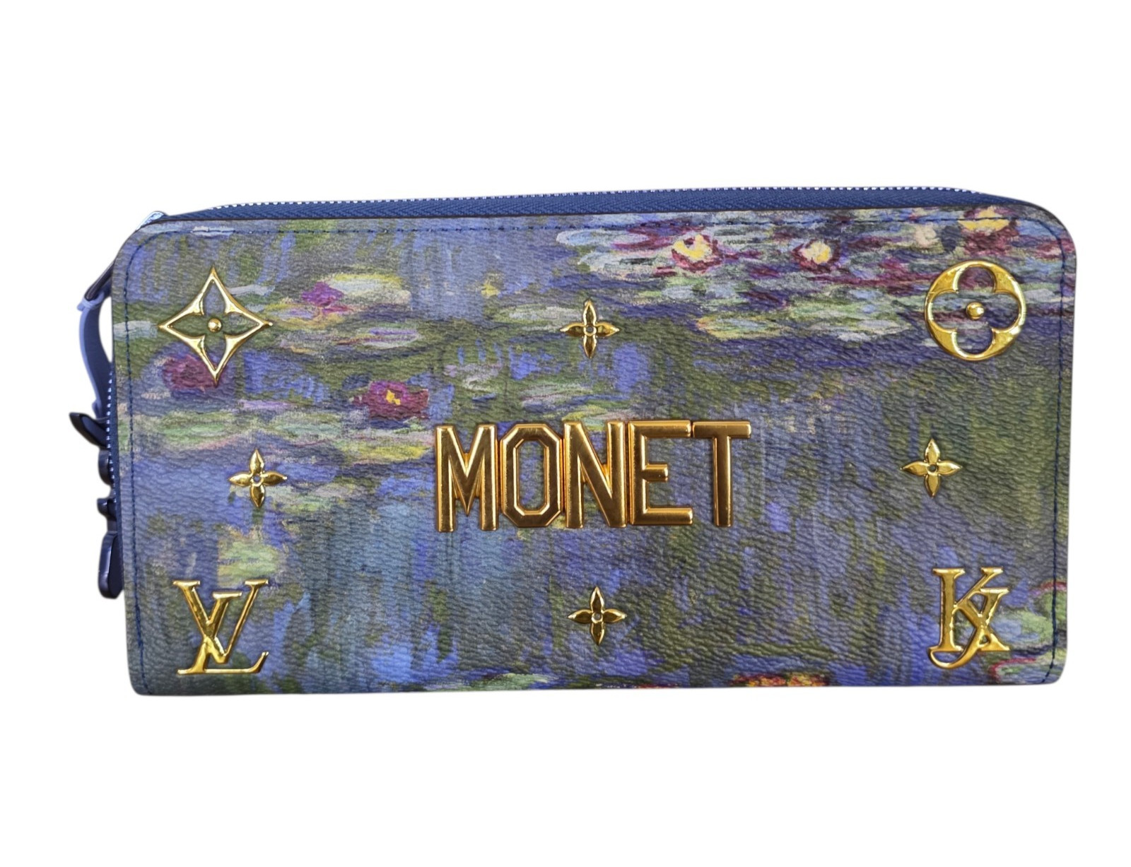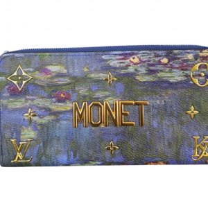 Louis Vuitton Zippy Wallet from the Masters Collection, a collaboration with renowned artist Jeff Koons, featuring Claude Monet’s iconic Water Lilies artwork. The exterior displays a painterly blend of blue and green tones on coated canvas, accented with gold-tone LV monogram details and bold raised MONET lettering. Zip-around closure with blue leather trim and an oversized zipper pull.